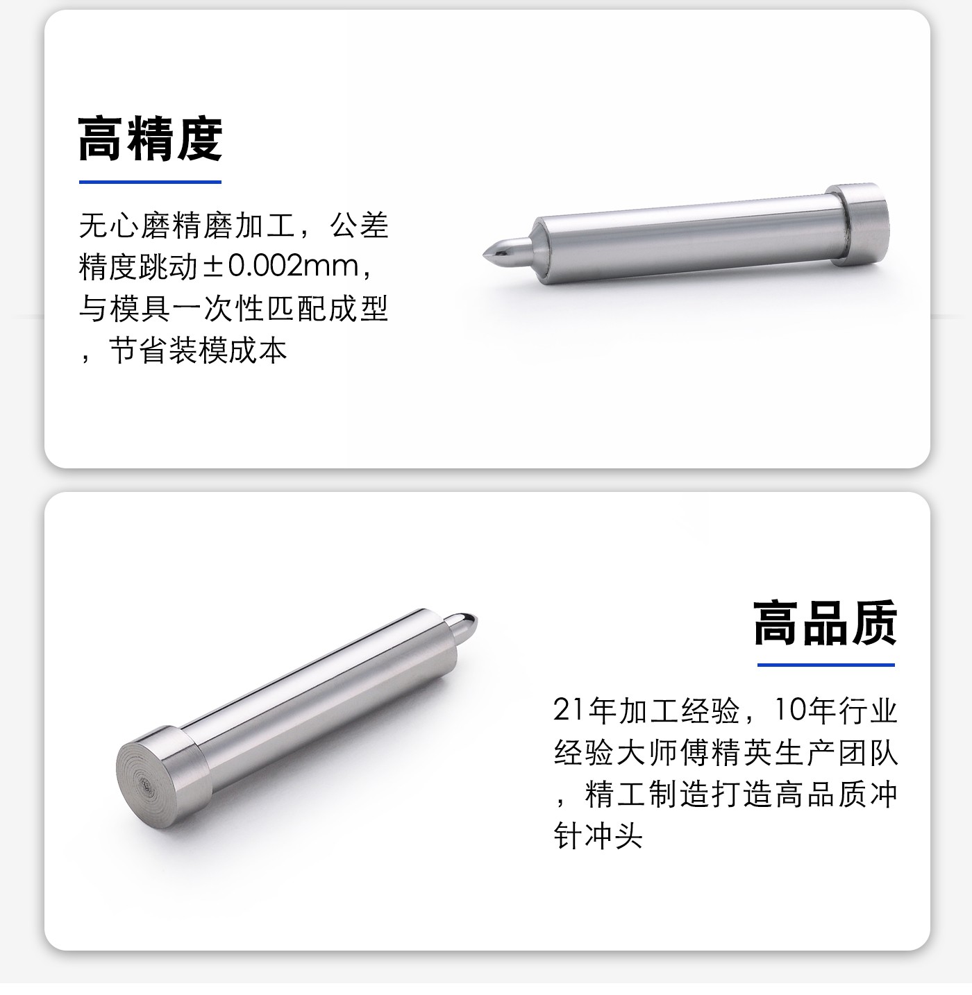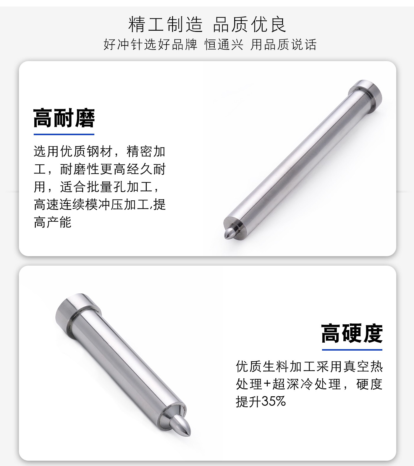 深圳市恒通興科技專業(yè)21年加工定制抽芽沖針等各種五金沖壓沖針沖頭,產(chǎn)品材質(zhì)正宗,公差精度±0.002mm,硬度高耐磨損,使用壽命強(qiáng)3倍。