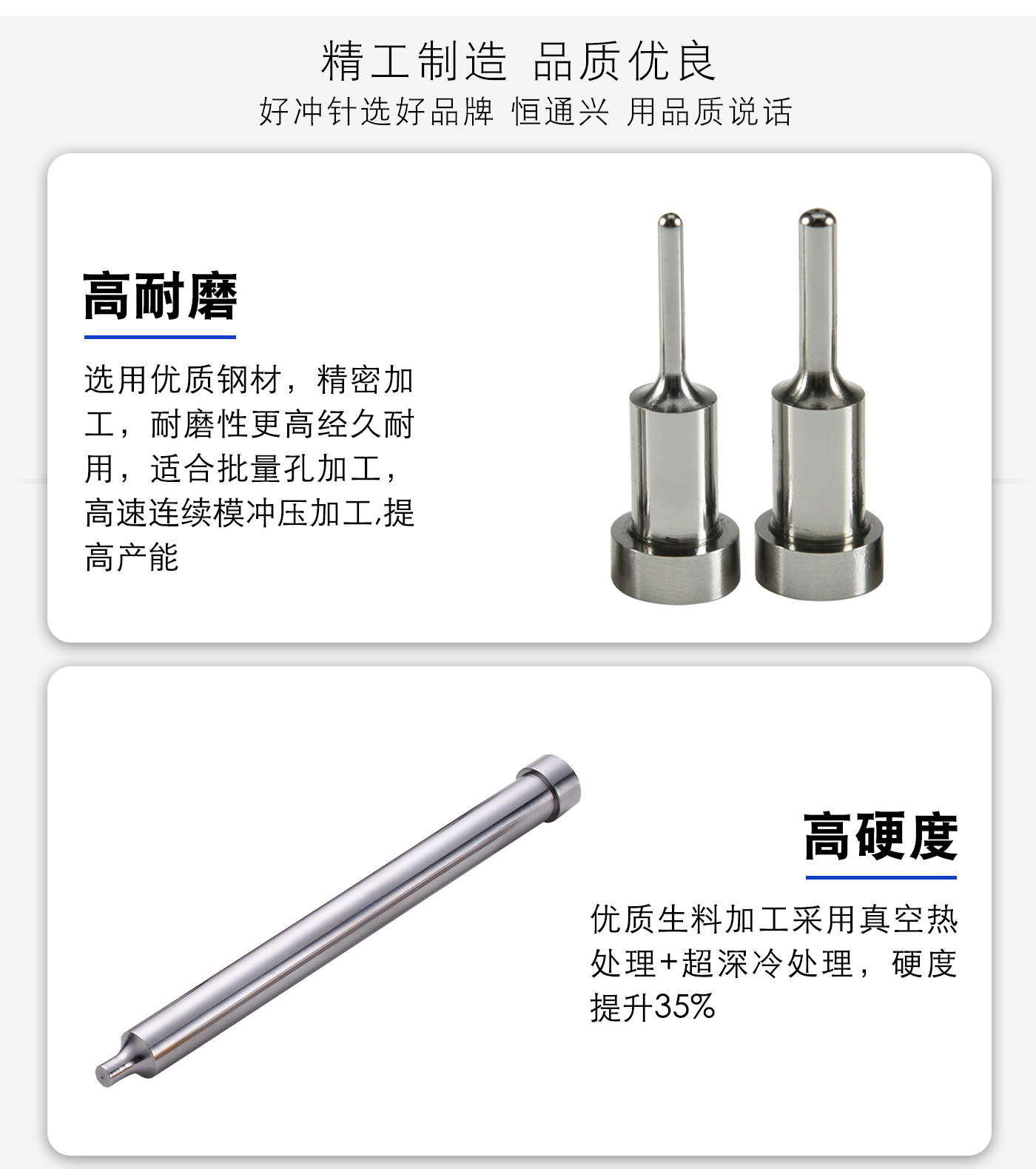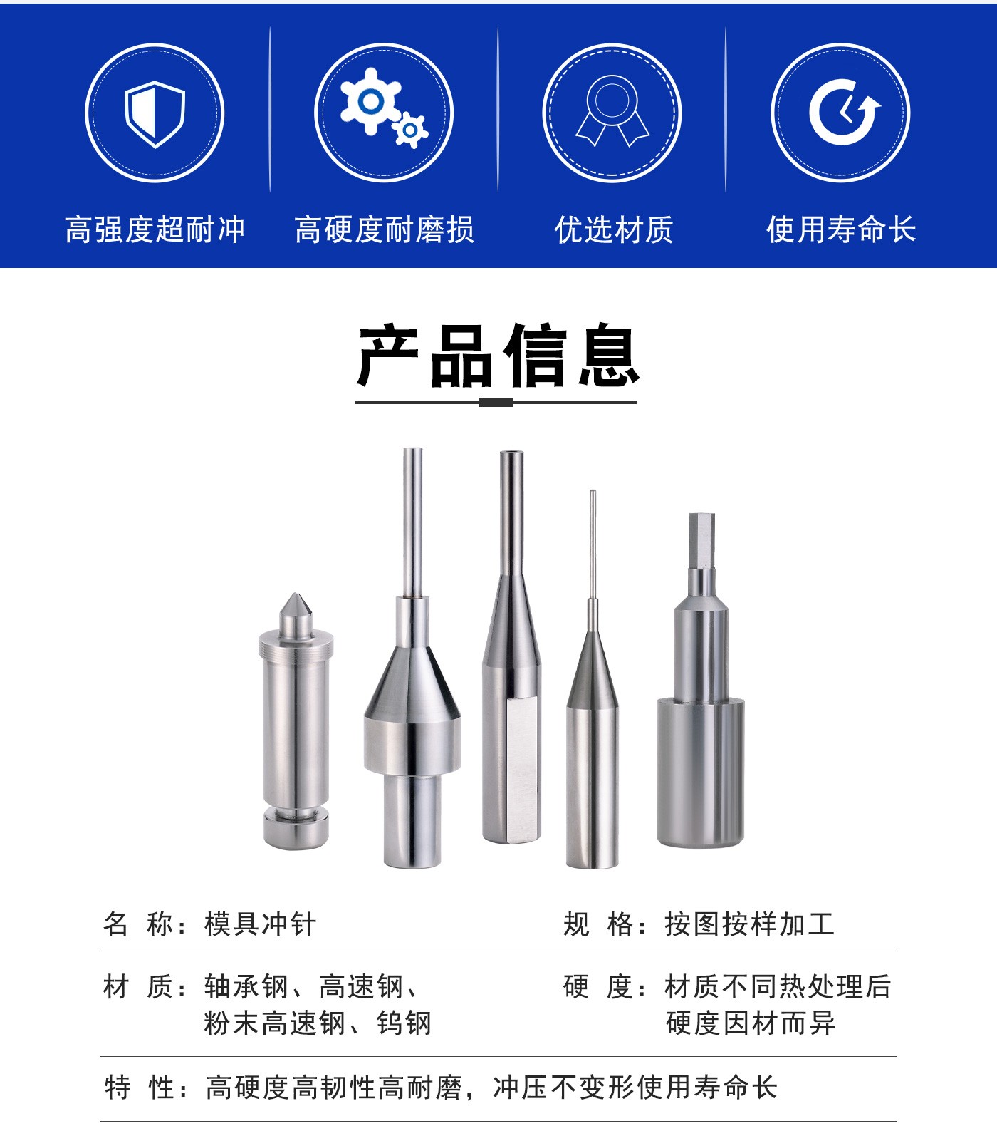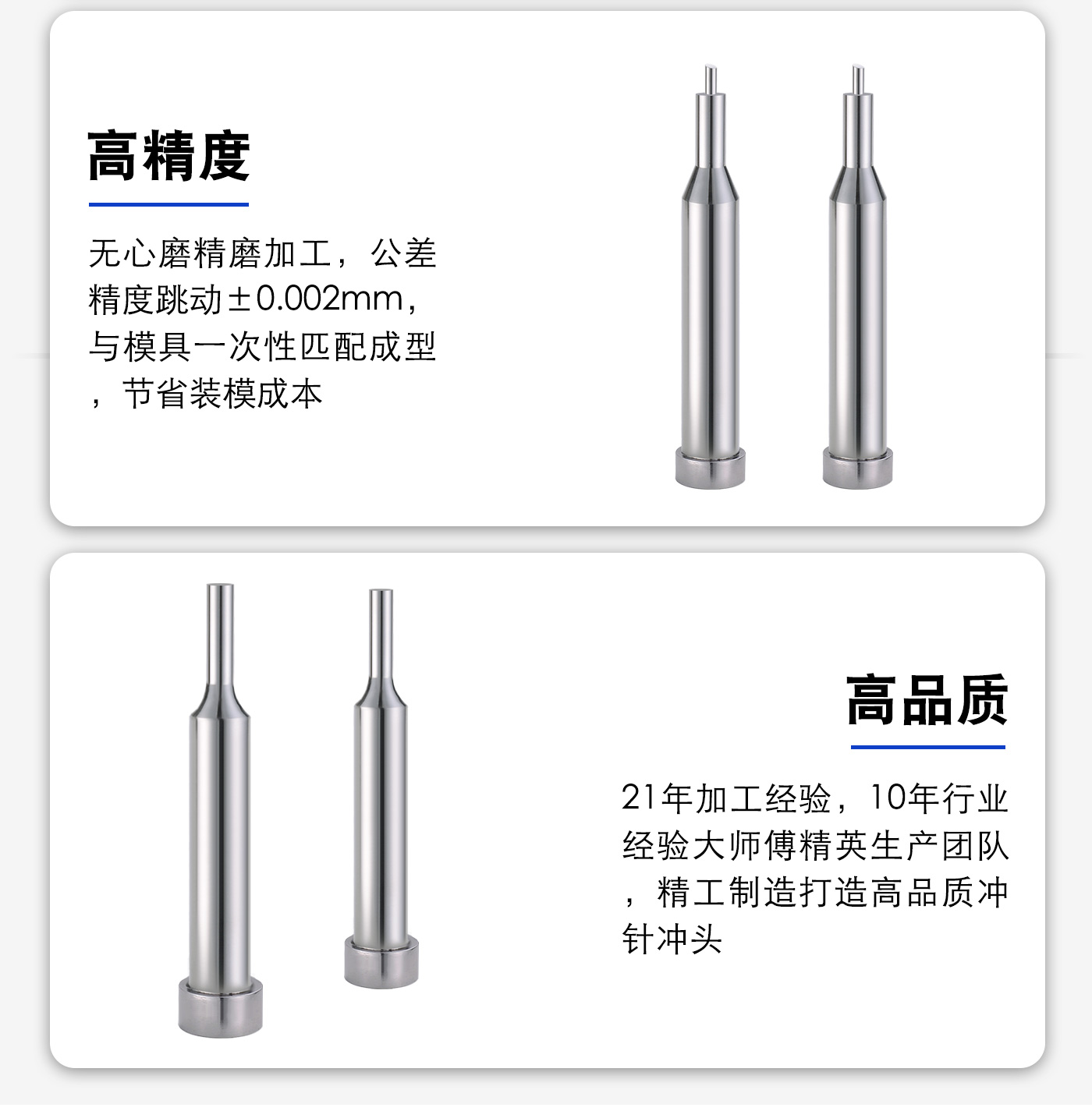深圳市恒通興科技專業(yè)21年加工定制模具沖針等各種五金沖壓用的沖針沖頭,產(chǎn)品材質(zhì)正宗,公差精度±0.002mm,硬度高耐磨損,使用壽命強(qiáng)3倍。