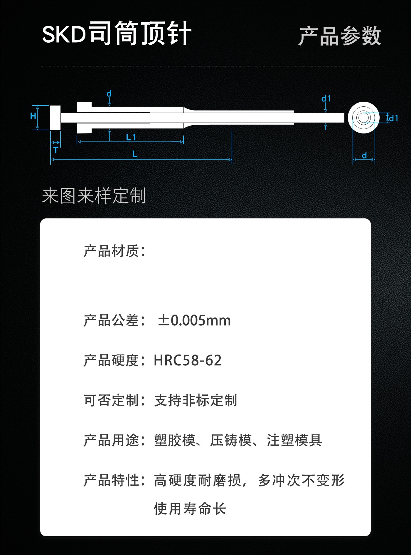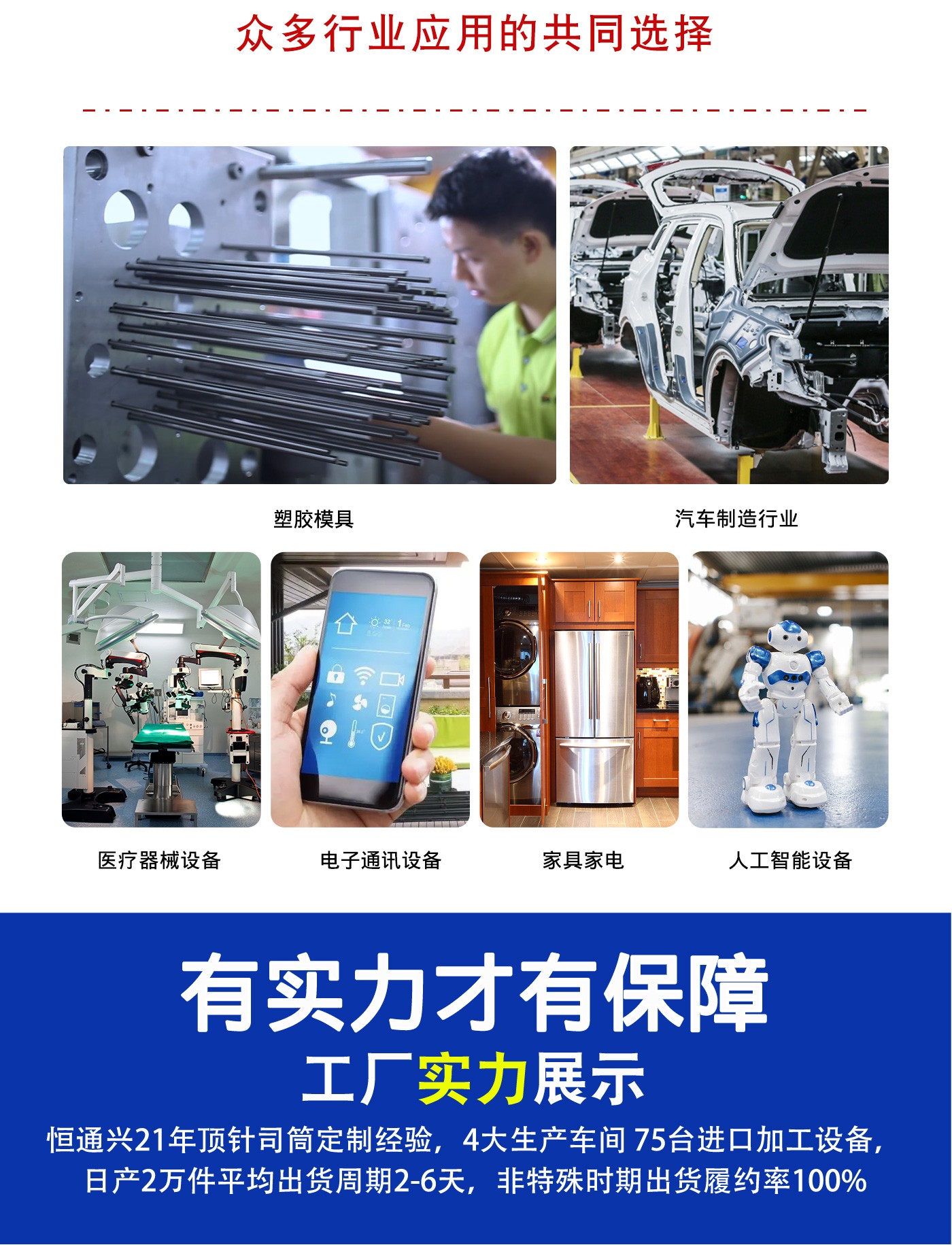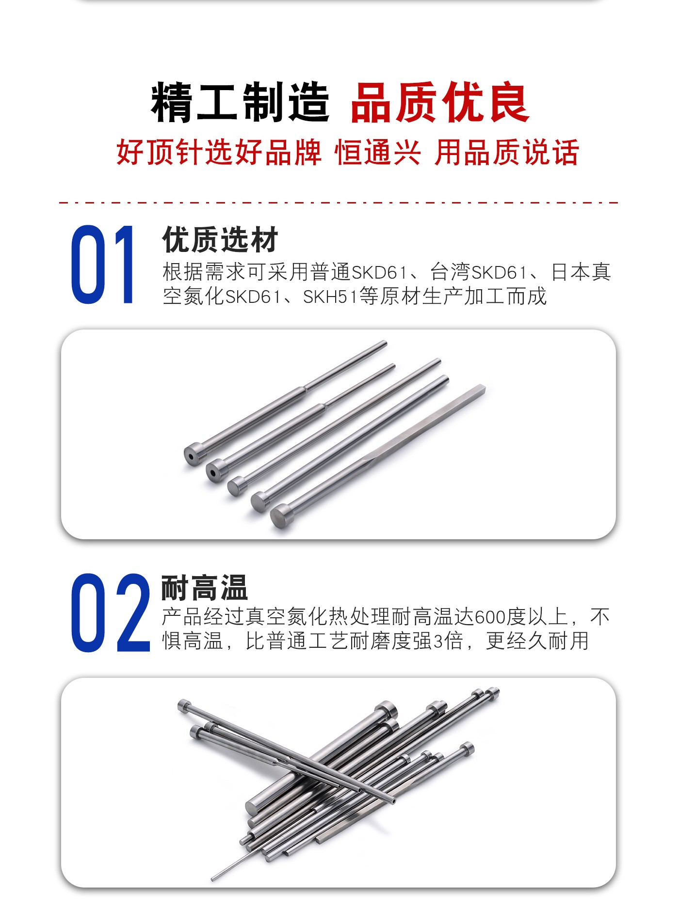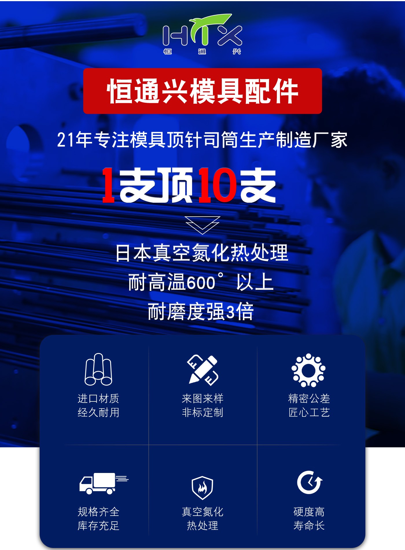 恒通興專業(yè)加工SKD司筒頂針,21年塑膠模具配件頂針?biāo)就布庸そ?jīng)驗(yàn),優(yōu)質(zhì)選材,公差精密,產(chǎn)品耐高溫同心度高經(jīng)久耐用,標(biāo)準(zhǔn)規(guī)格型號(hào)齊全,現(xiàn)貨10萬庫存,非標(biāo)可來圖來樣加工定制。