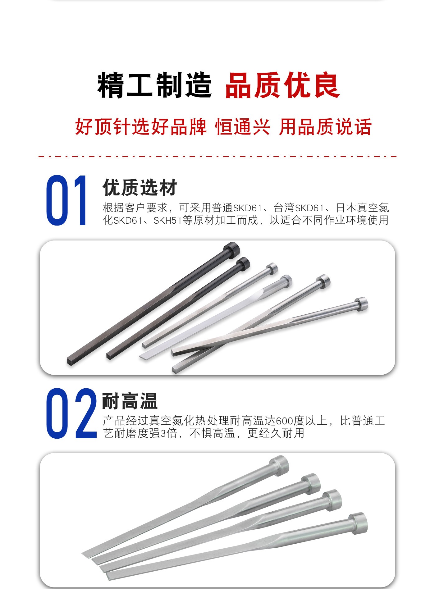 恒通興專業(yè)加工扁頂針,21年塑膠模具配件扁頂針、扁銷加工經(jīng)驗(yàn),優(yōu)質(zhì)選材,公差精密,產(chǎn)品耐高溫同心度高經(jīng)久耐用,標(biāo)準(zhǔn)規(guī)格型號(hào)齊全,現(xiàn)貨10萬(wàn)庫(kù)存,非標(biāo)來(lái)圖來(lái)樣加工定制。