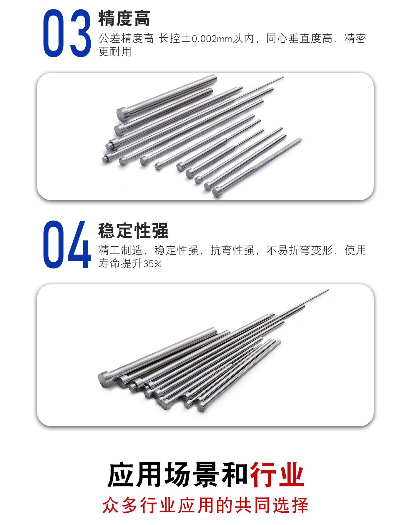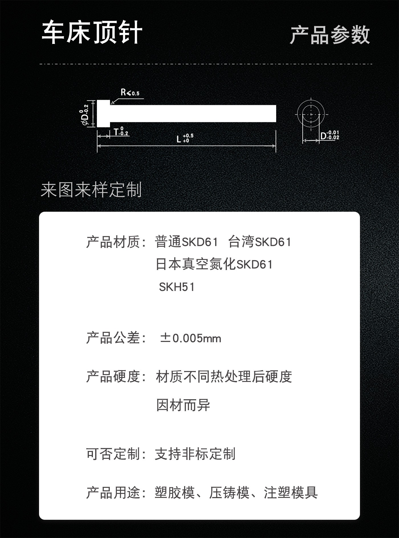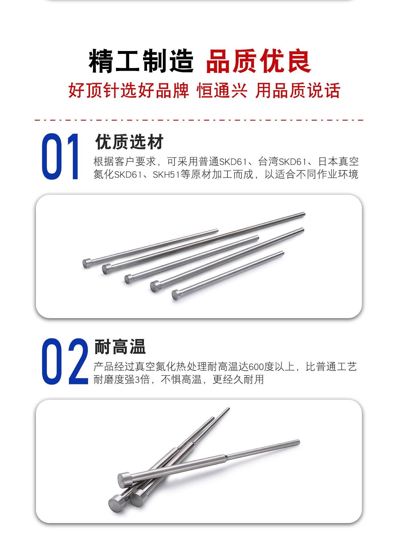 恒通興專業(yè)加工車床頂針,21年塑膠模具配件頂針加工經(jīng)驗,優(yōu)質(zhì)選材,公差精密,產(chǎn)品耐高溫同心度高經(jīng)久耐用,標準規(guī)格型號齊全,現(xiàn)貨10萬庫存,非標來圖來樣加工定制。