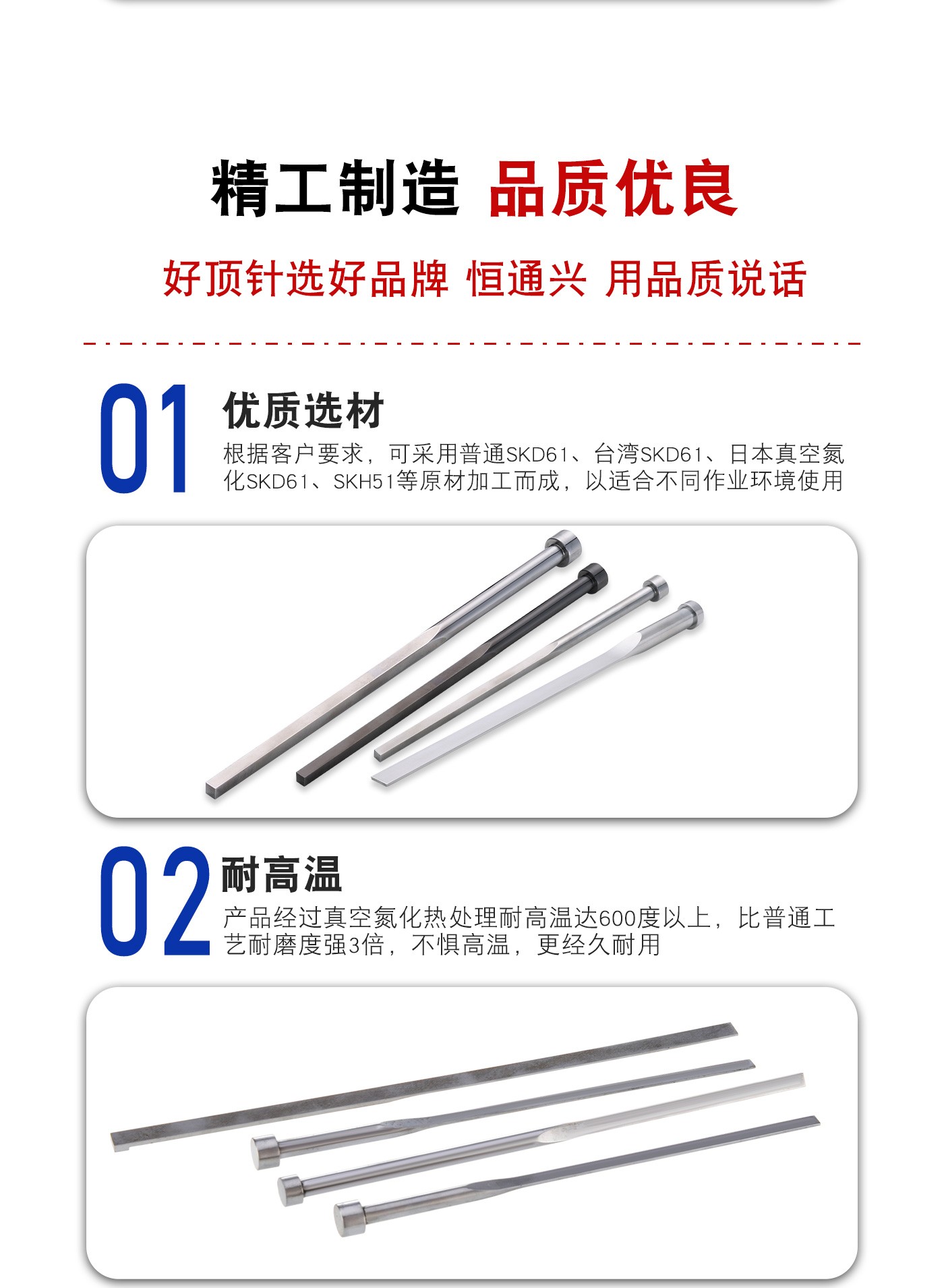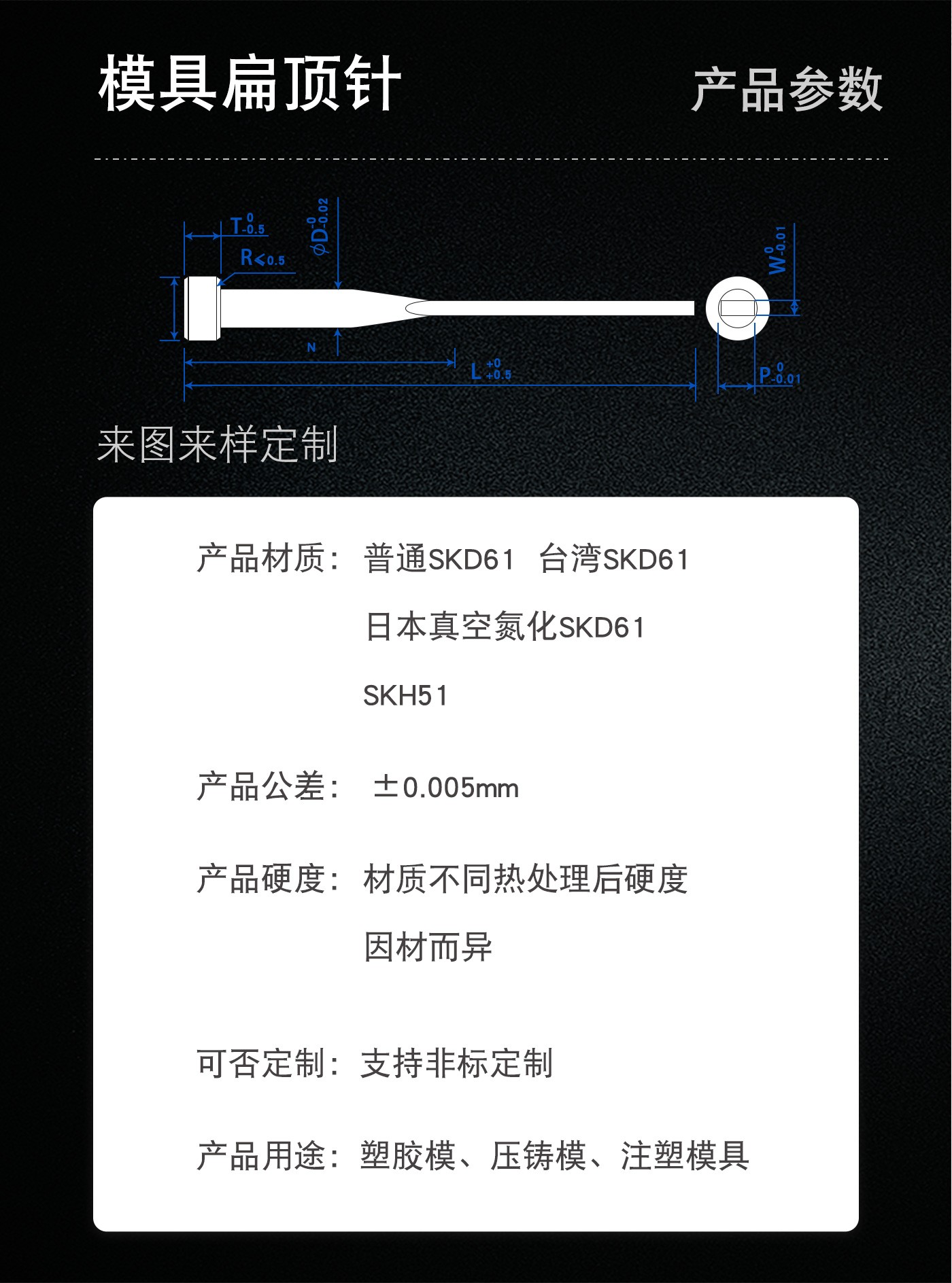 恒通興專業(yè)加工模具扁頂針,21年塑膠模具配件加工經(jīng)驗(yàn),優(yōu)質(zhì)選材,公差精密,產(chǎn)品耐高溫同心度高經(jīng)久耐用,標(biāo)準(zhǔn)規(guī)格型號(hào)齊全,現(xiàn)貨10萬(wàn)庫(kù)存,非標(biāo)來(lái)圖來(lái)樣加工定制。