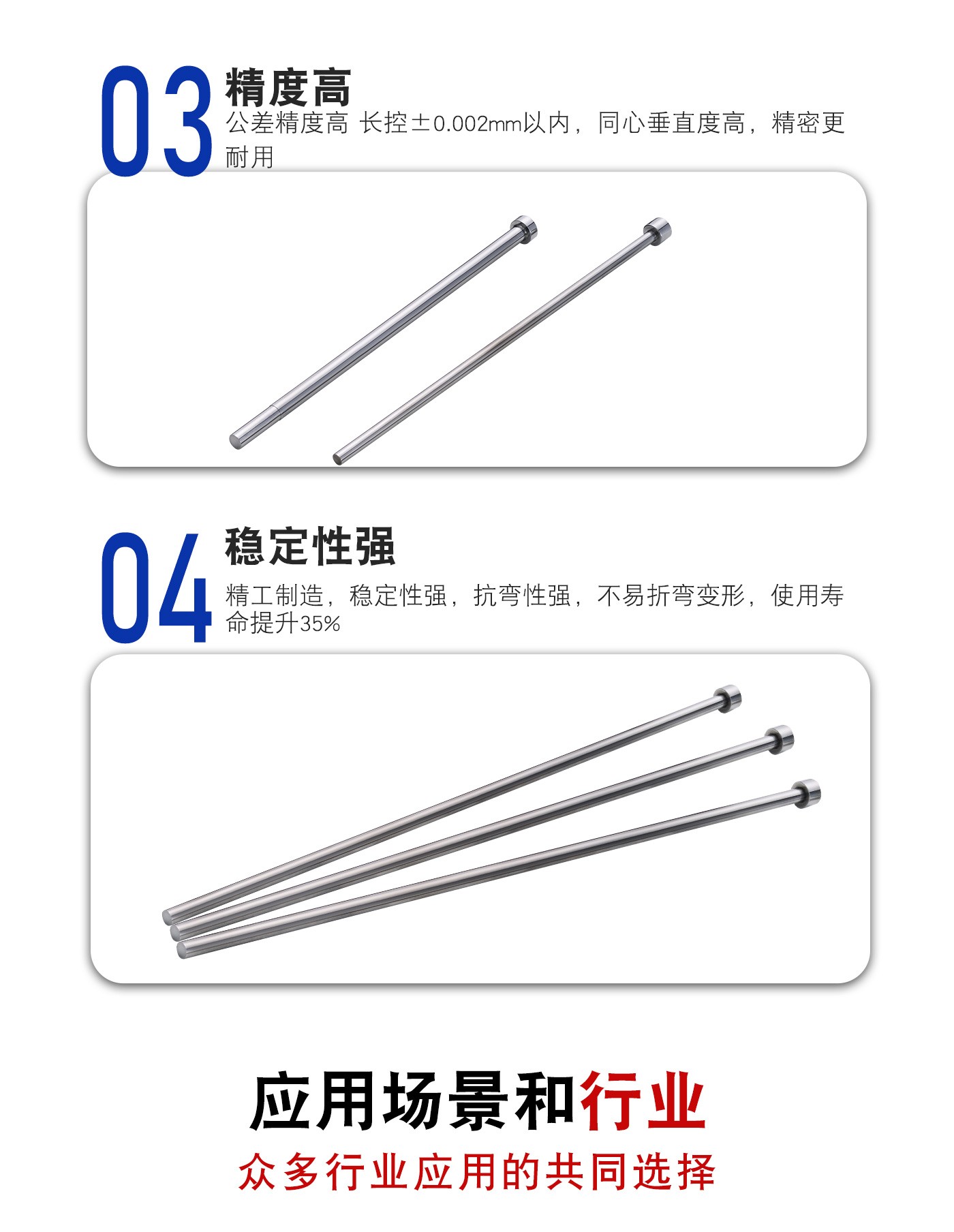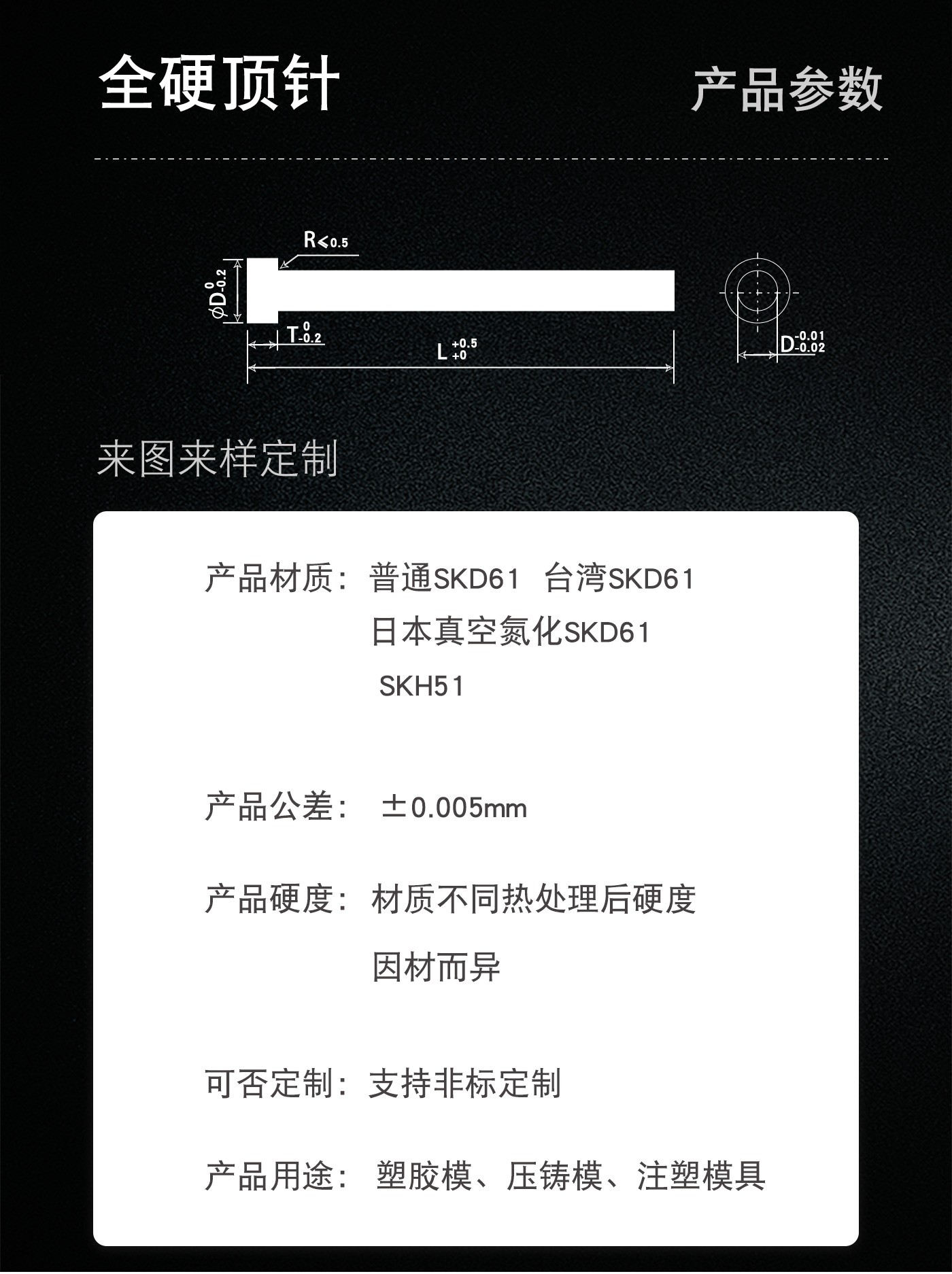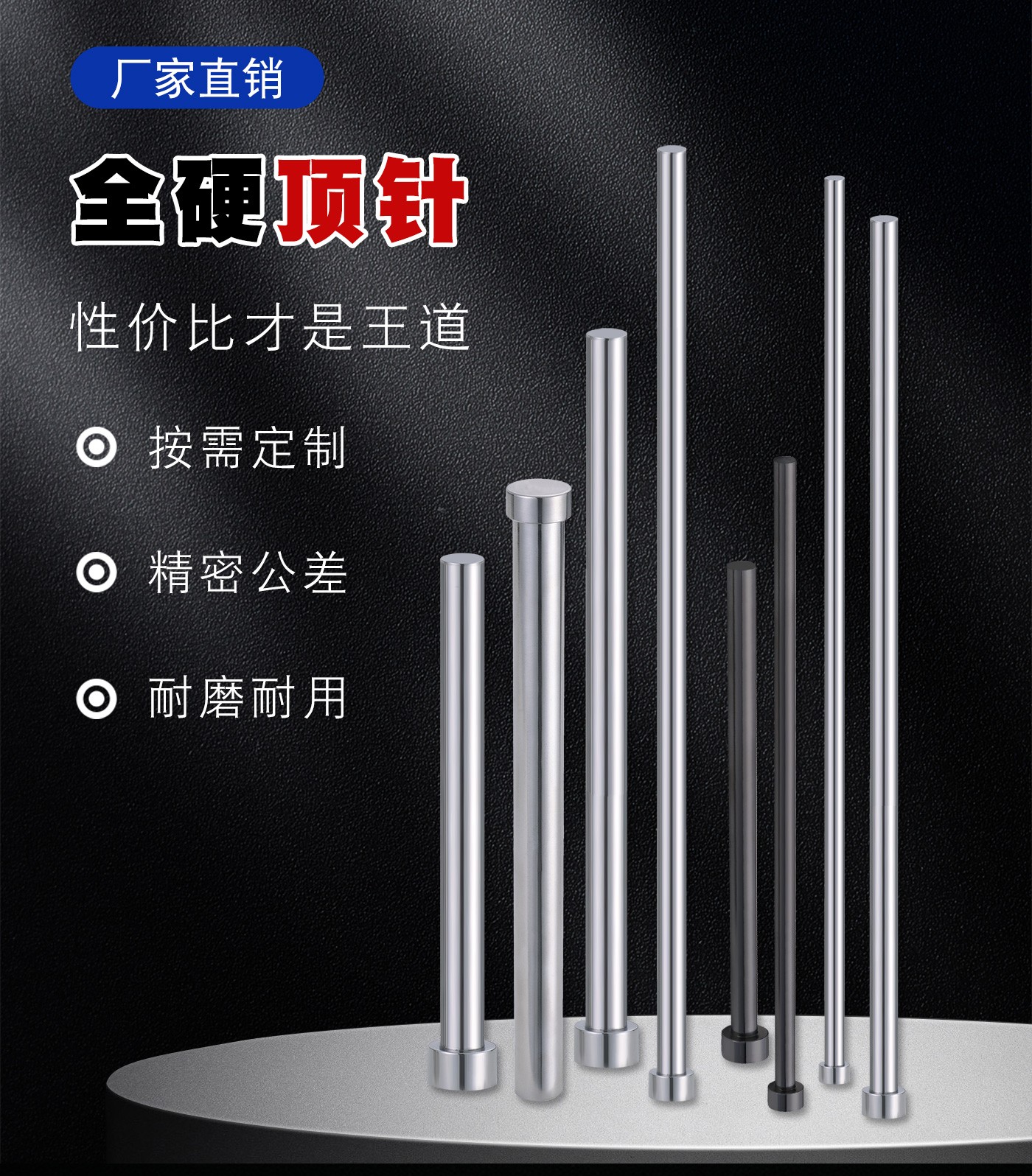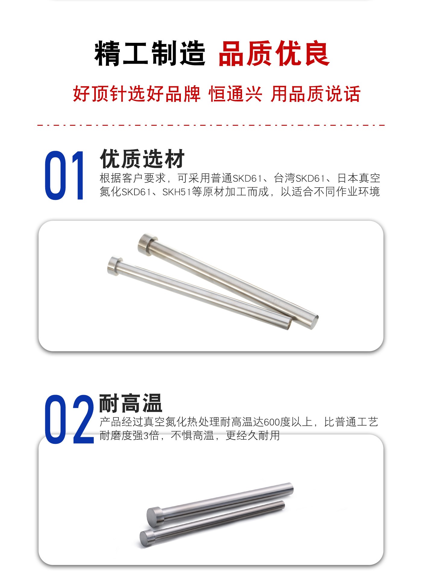 恒通興專業(yè)加工全硬頂針,21年塑膠模具配件頂針加工經(jīng)驗,優(yōu)質(zhì)選材,真空氮化處理,硬度高,產(chǎn)品耐高溫600度,公差精密,同心度高經(jīng)久耐用,標(biāo)準(zhǔn)規(guī)格型號齊全,現(xiàn)貨10萬庫存,非標(biāo)來圖來樣加工定制。