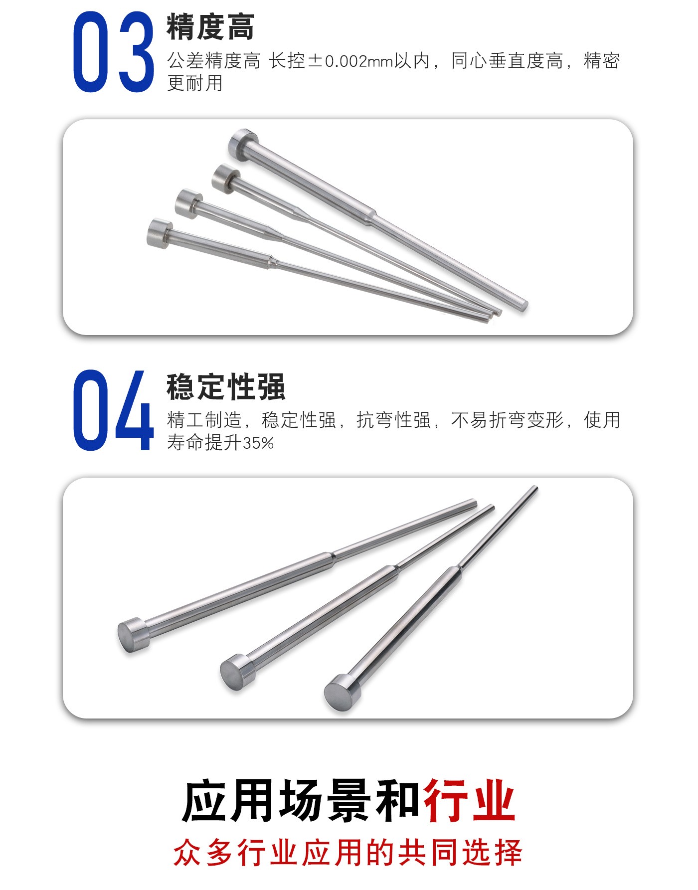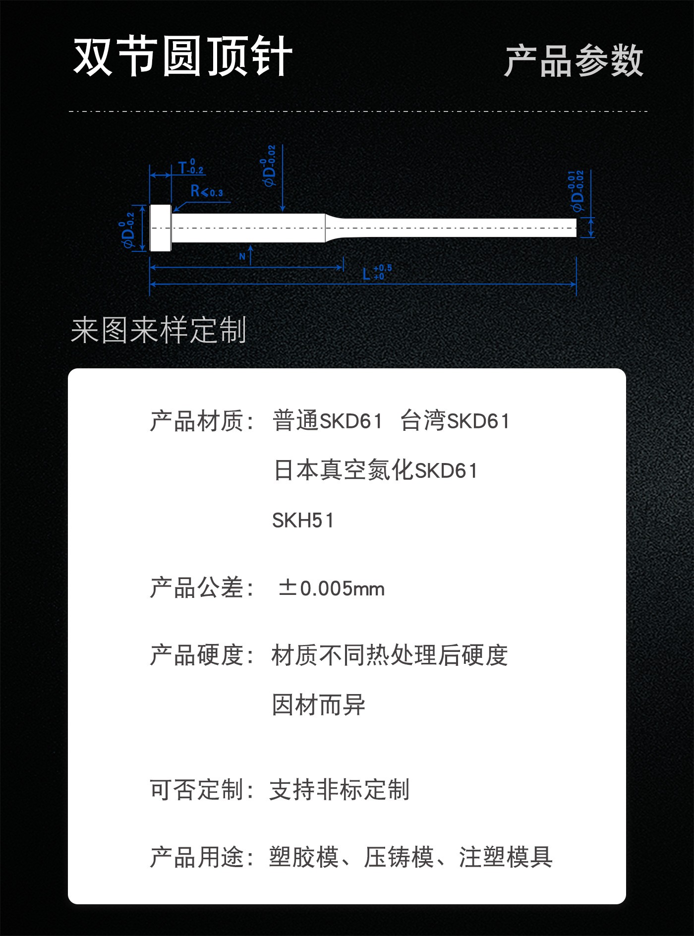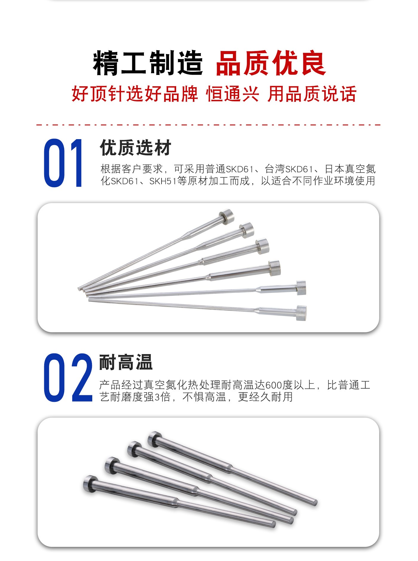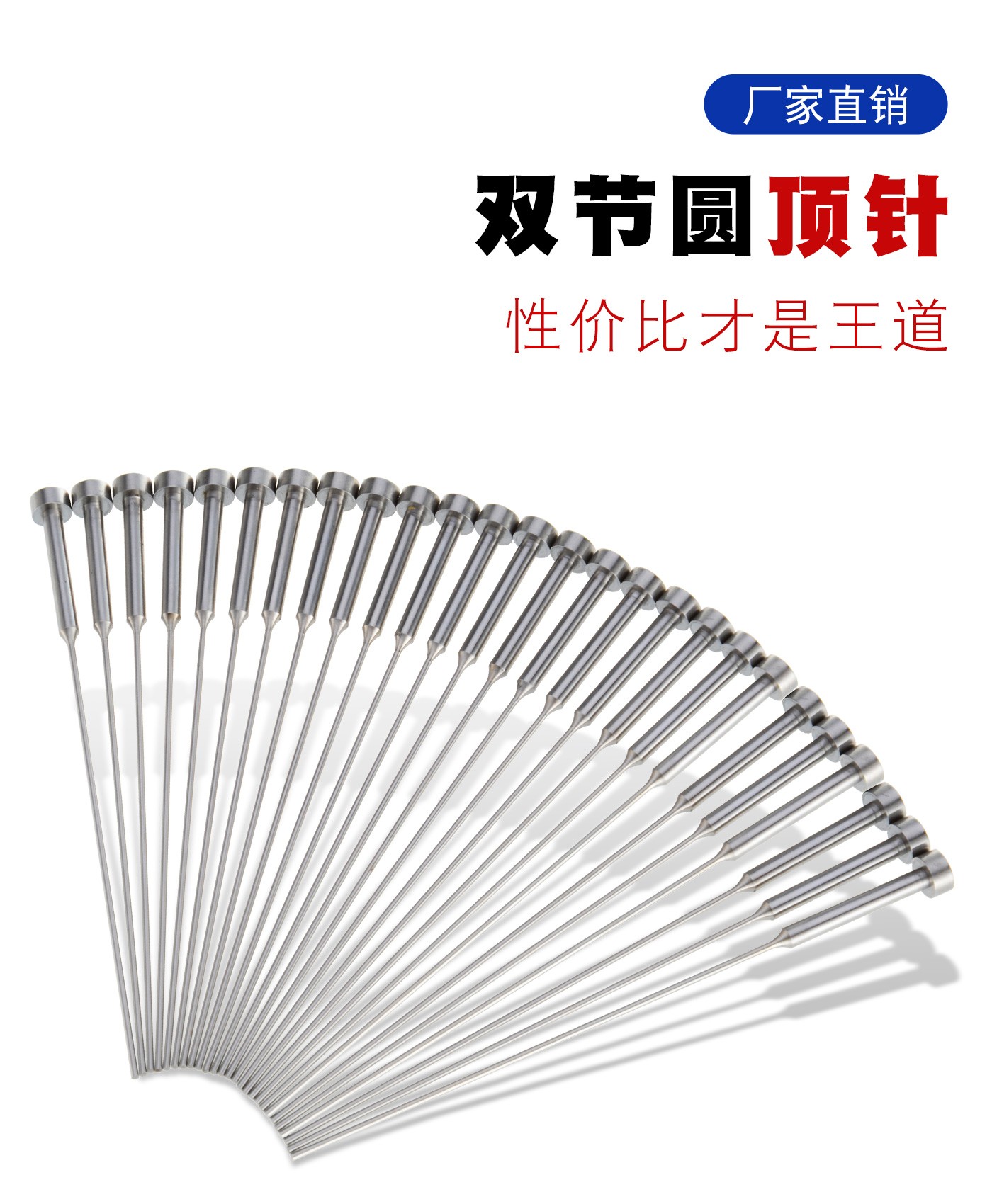 雙節(jié)頂針又叫模具托針,有托頂針,用于塑膠模,壓鑄模等行業(yè),恒通興雙節(jié)頂針硬度高,韌性好,耐高溫精密耐用,歡迎咨詢。