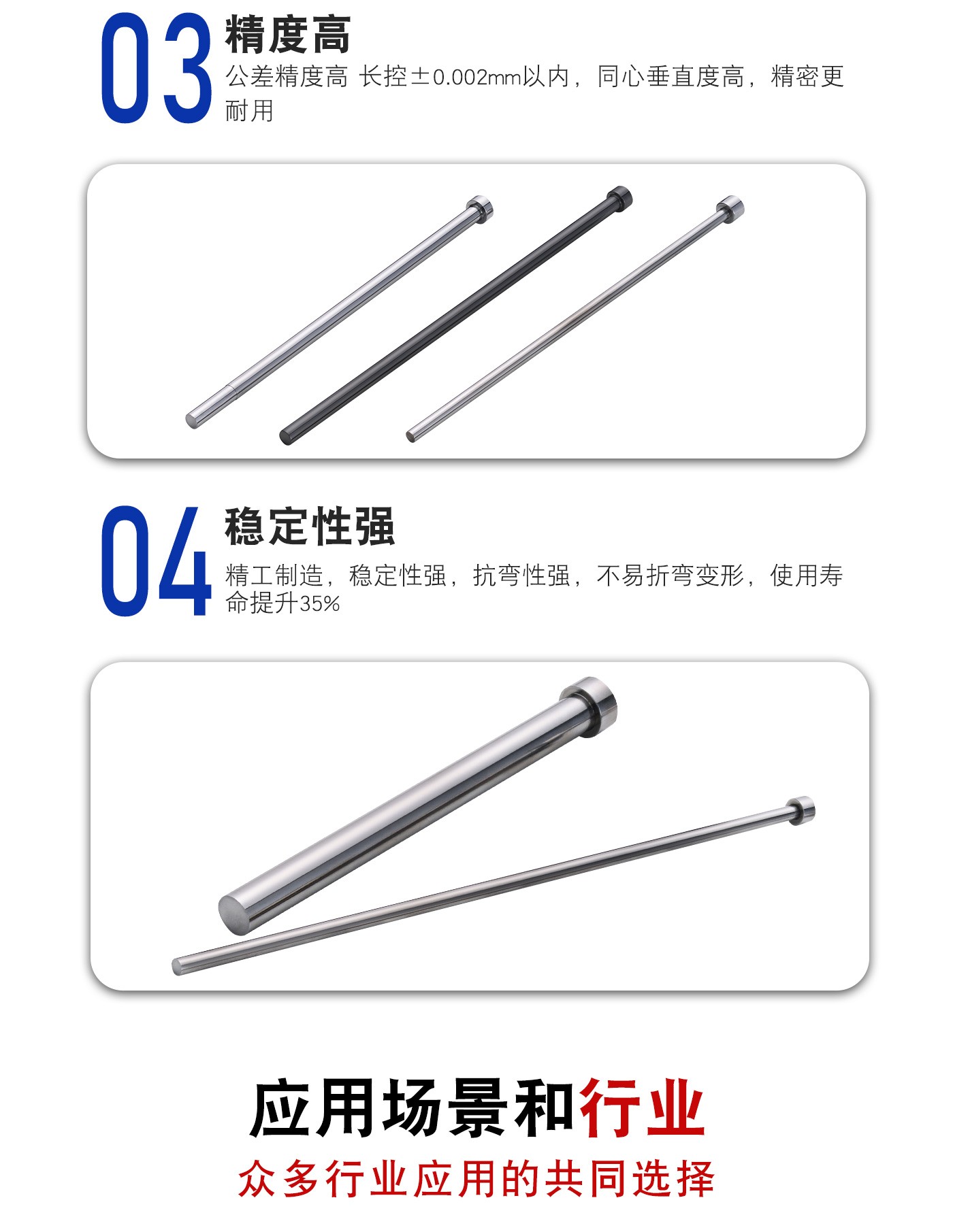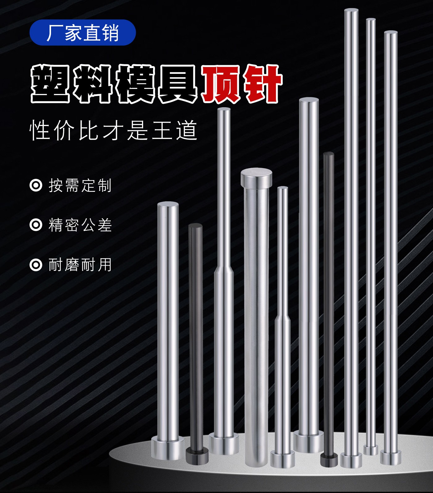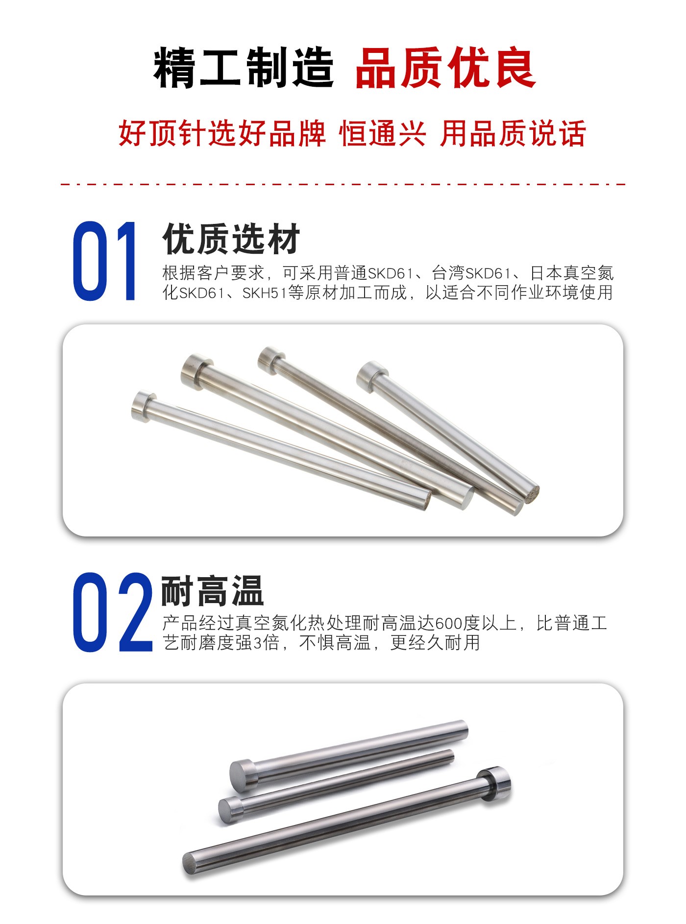 恒通興專(zhuān)業(yè)加工塑料模具頂針,21年塑膠模具配件頂針加工經(jīng)驗(yàn),優(yōu)質(zhì)選材,真空氮化處理,硬度高,產(chǎn)品耐高溫600度,公差精密,同心度高經(jīng)久耐用,標(biāo)準(zhǔn)規(guī)格型號(hào)齊全,現(xiàn)貨10萬(wàn)庫(kù)存,非標(biāo)來(lái)圖來(lái)樣加工定制。
