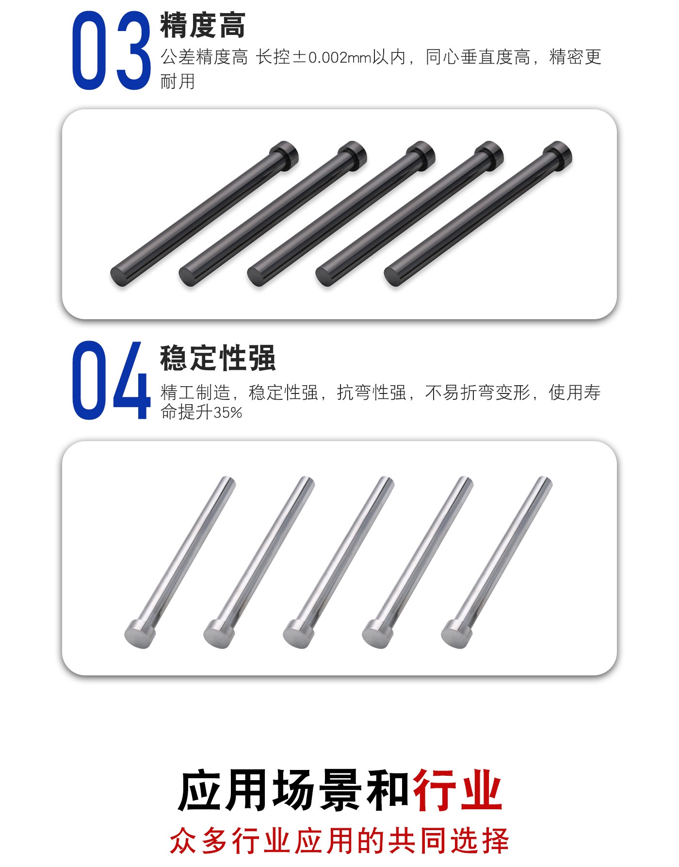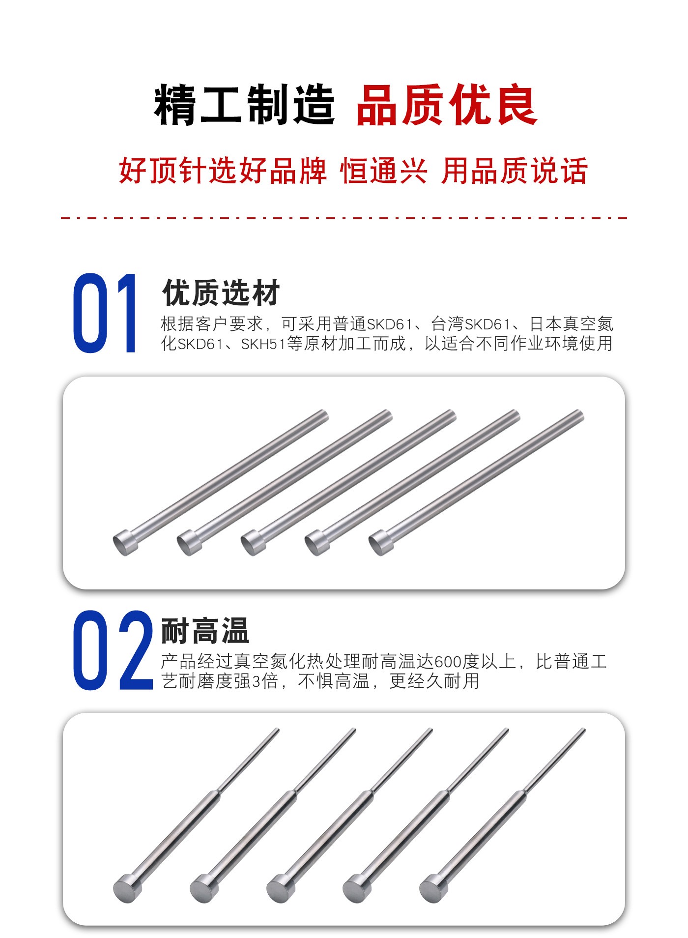 恒通興專業(yè)加工脫料頂針,21年塑膠模具配件頂針加工經(jīng)驗(yàn),優(yōu)質(zhì)選材,真空氮化處理,硬度高,產(chǎn)品耐高溫600度,公差精密,同心度高經(jīng)久耐用,標(biāo)準(zhǔn)規(guī)格型號(hào)齊全,現(xiàn)貨10萬庫存,非標(biāo)來圖來樣加工定制。