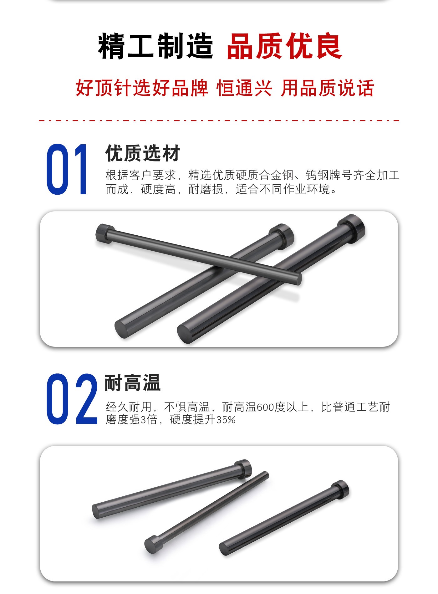 恒通興專業(yè)加工鎢鋼圓件頂針,21年塑膠模具配件頂針加工經(jīng)驗,優(yōu)質(zhì)選材,真空氮化處理,硬度高,產(chǎn)品耐高溫600度,公差精密,同心度高經(jīng)久耐用,標準規(guī)格型號齊全,現(xiàn)貨10萬庫存,非標來圖來樣加工定制。