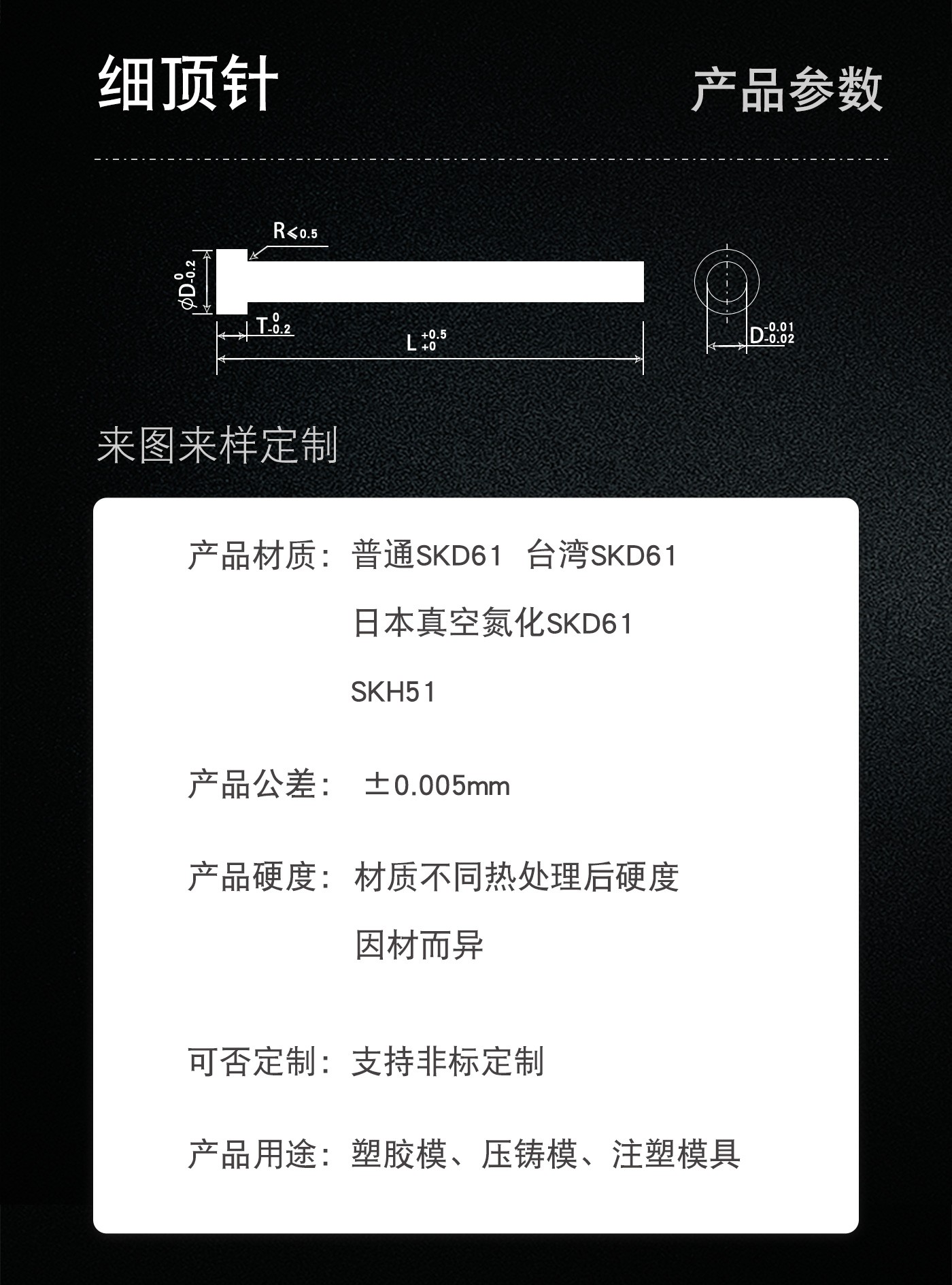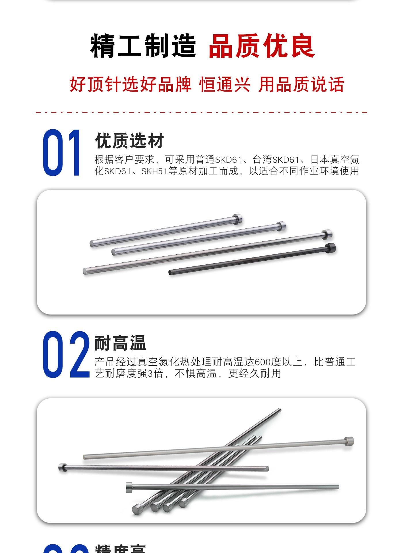 恒通興專業(yè)加工細(xì)頂針,21年塑膠模具配件頂針加工經(jīng)驗(yàn),優(yōu)質(zhì)選材,真空氮化處理,硬度高,產(chǎn)品耐高溫600度,公差精密,同心度高經(jīng)久耐用,標(biāo)準(zhǔn)規(guī)格型號(hào)齊全,現(xiàn)貨10萬(wàn)庫(kù)存,非標(biāo)來(lái)圖來(lái)樣加工定制。