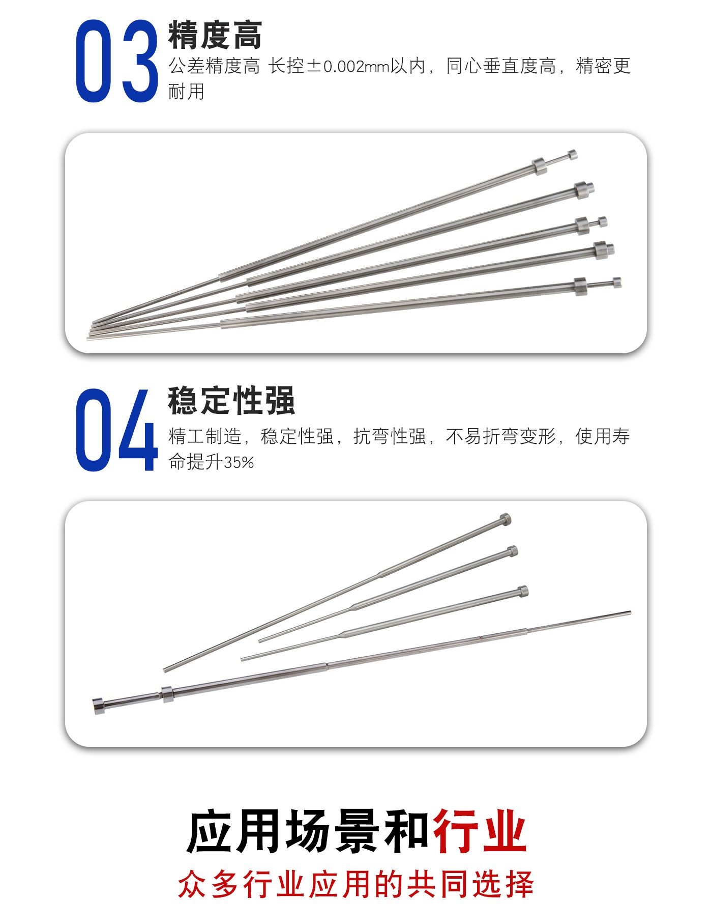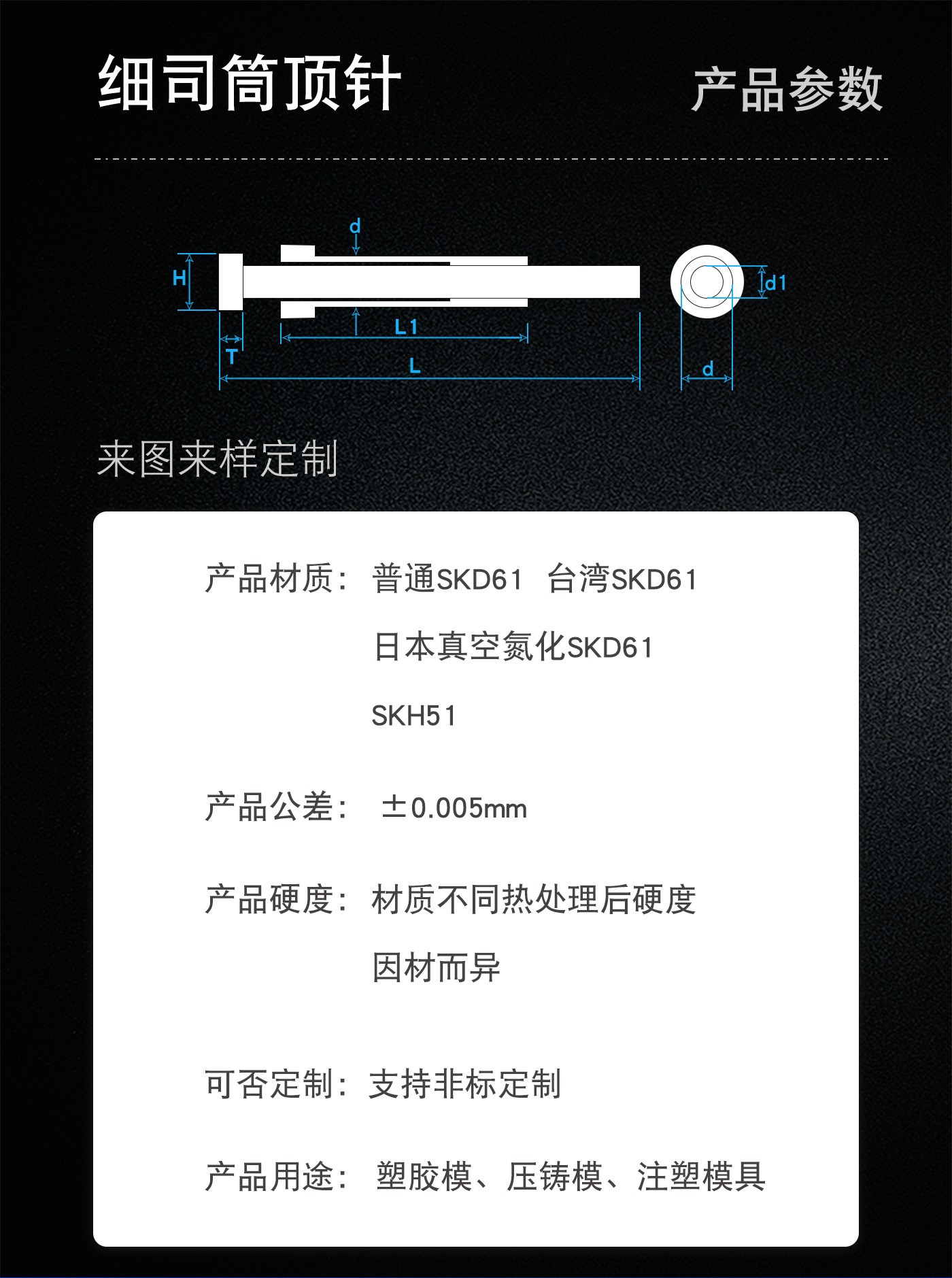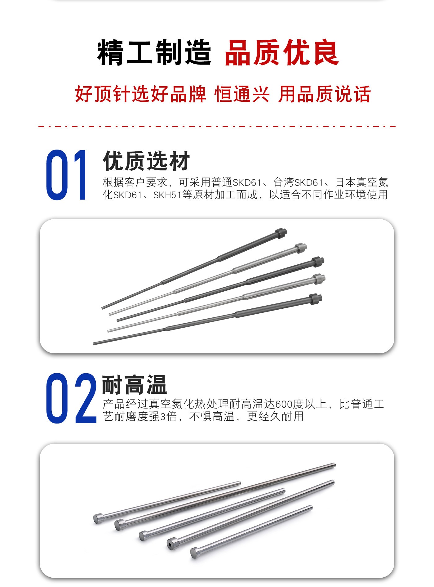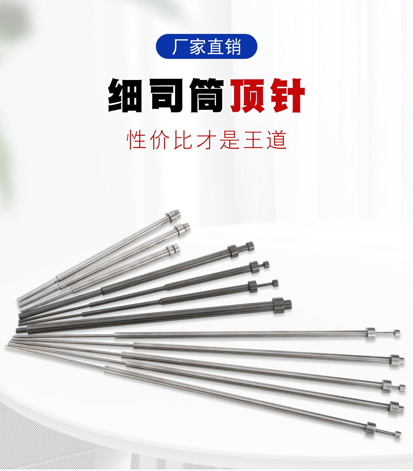 恒通興專業(yè)加工細司筒頂針,21年塑膠模具配件頂針加工經(jīng)驗,優(yōu)質(zhì)選材,真空氮化處理,硬度高,產(chǎn)品耐高溫600度,公差精密,同心度高經(jīng)久耐用,標準規(guī)格型號齊全,現(xiàn)貨10萬庫存,非標來圖來樣加工定制。