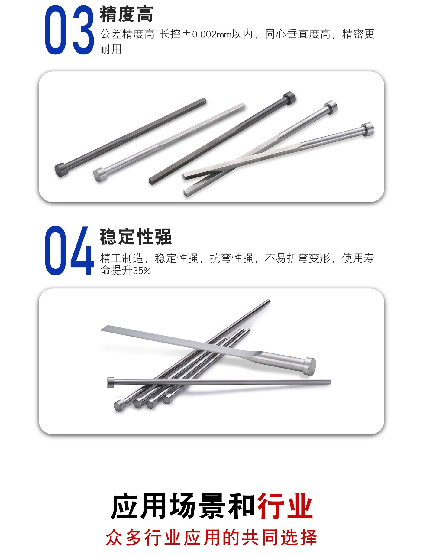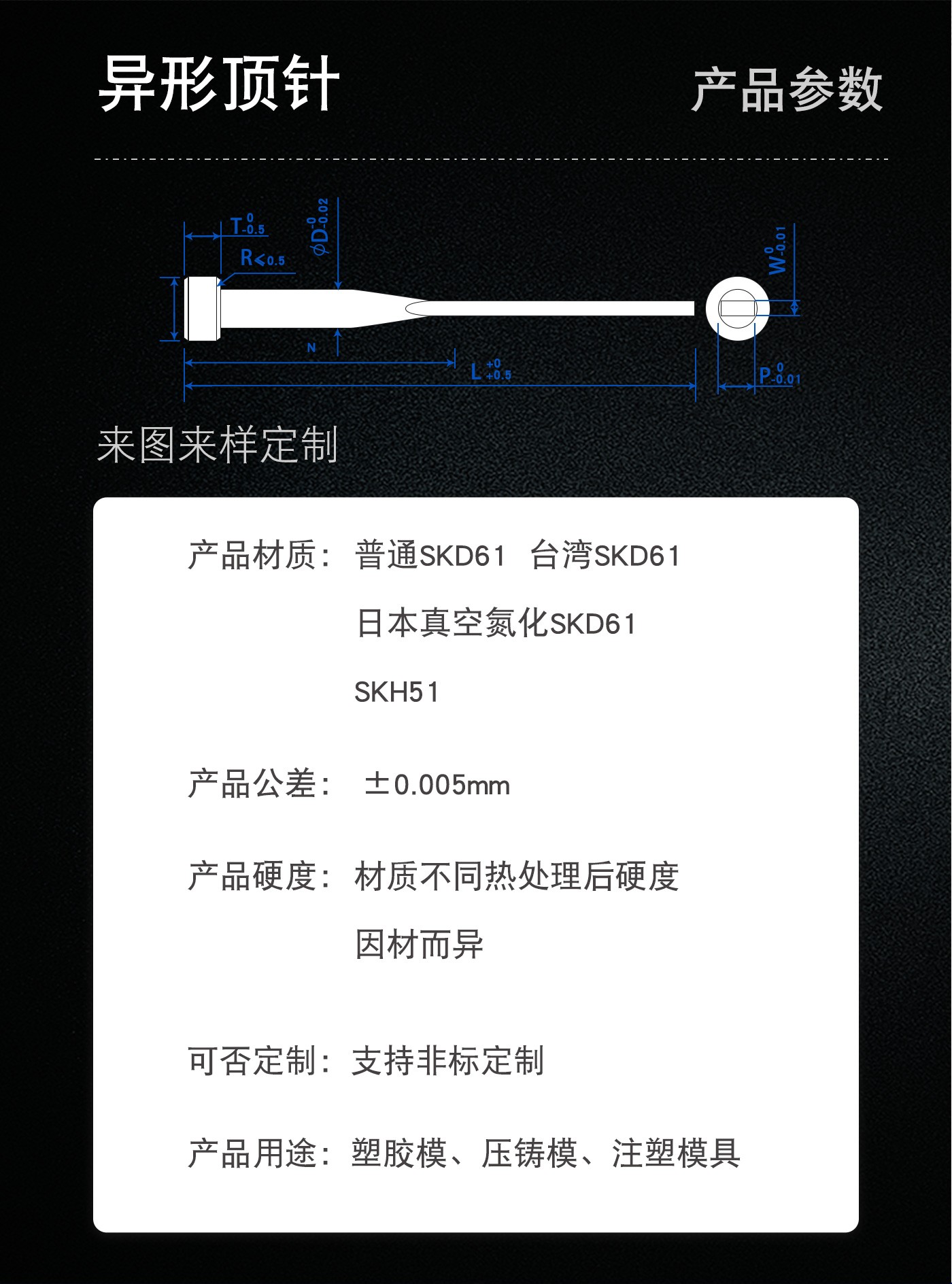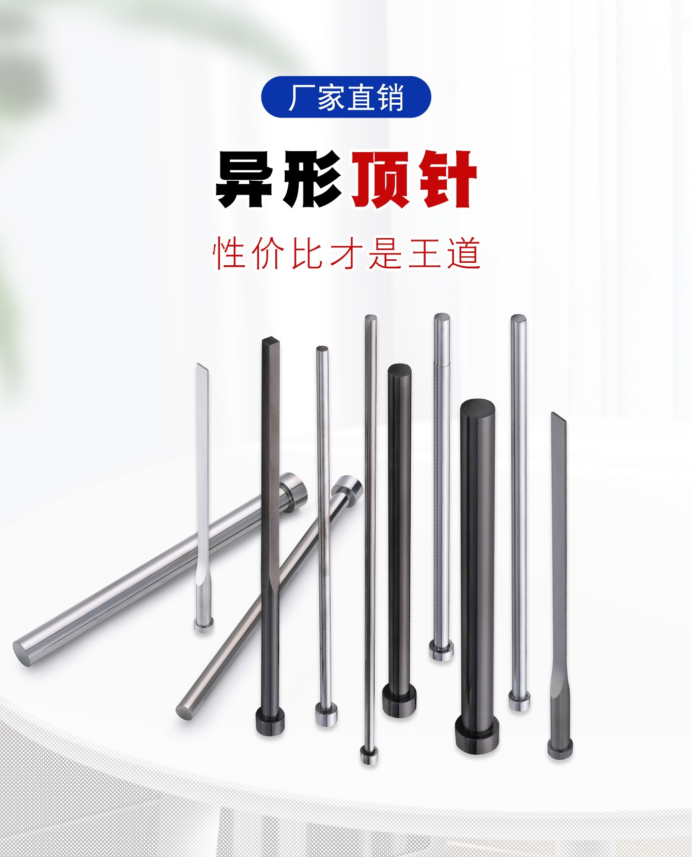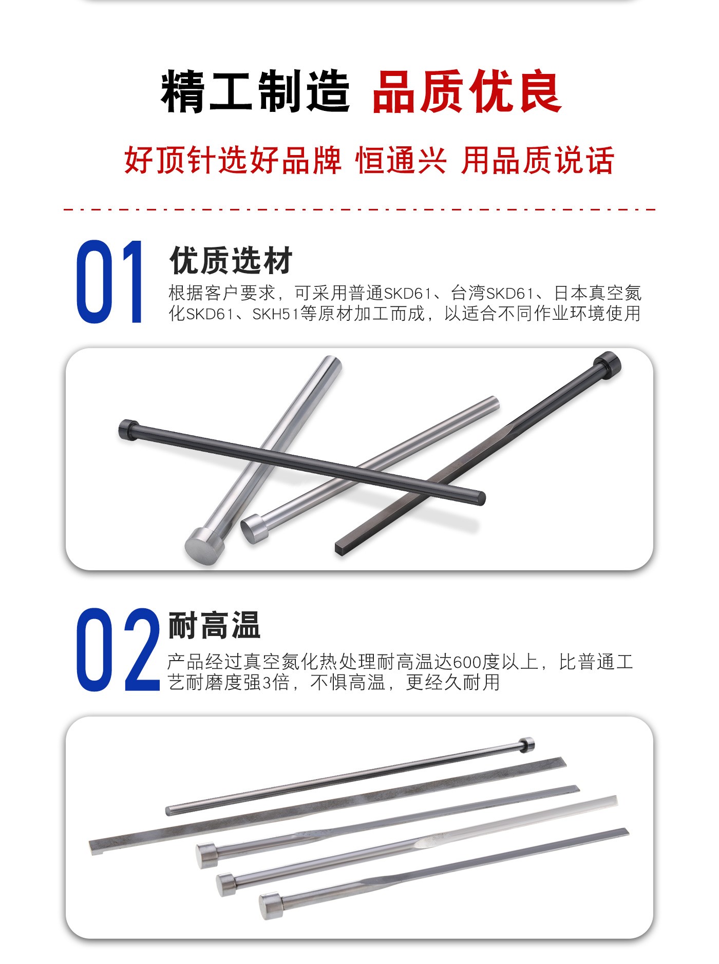 恒通興專業(yè)加工異形頂針,21年塑膠模具配件頂針加工經(jīng)驗(yàn),優(yōu)質(zhì)選材,真空氮化處理,硬度高,產(chǎn)品耐高溫600度,公差精密,同心度高經(jīng)久耐用,標(biāo)準(zhǔn)規(guī)格型號(hào)齊全,現(xiàn)貨10萬(wàn)庫(kù)存,非標(biāo)來(lái)圖來(lái)樣加工定制。
