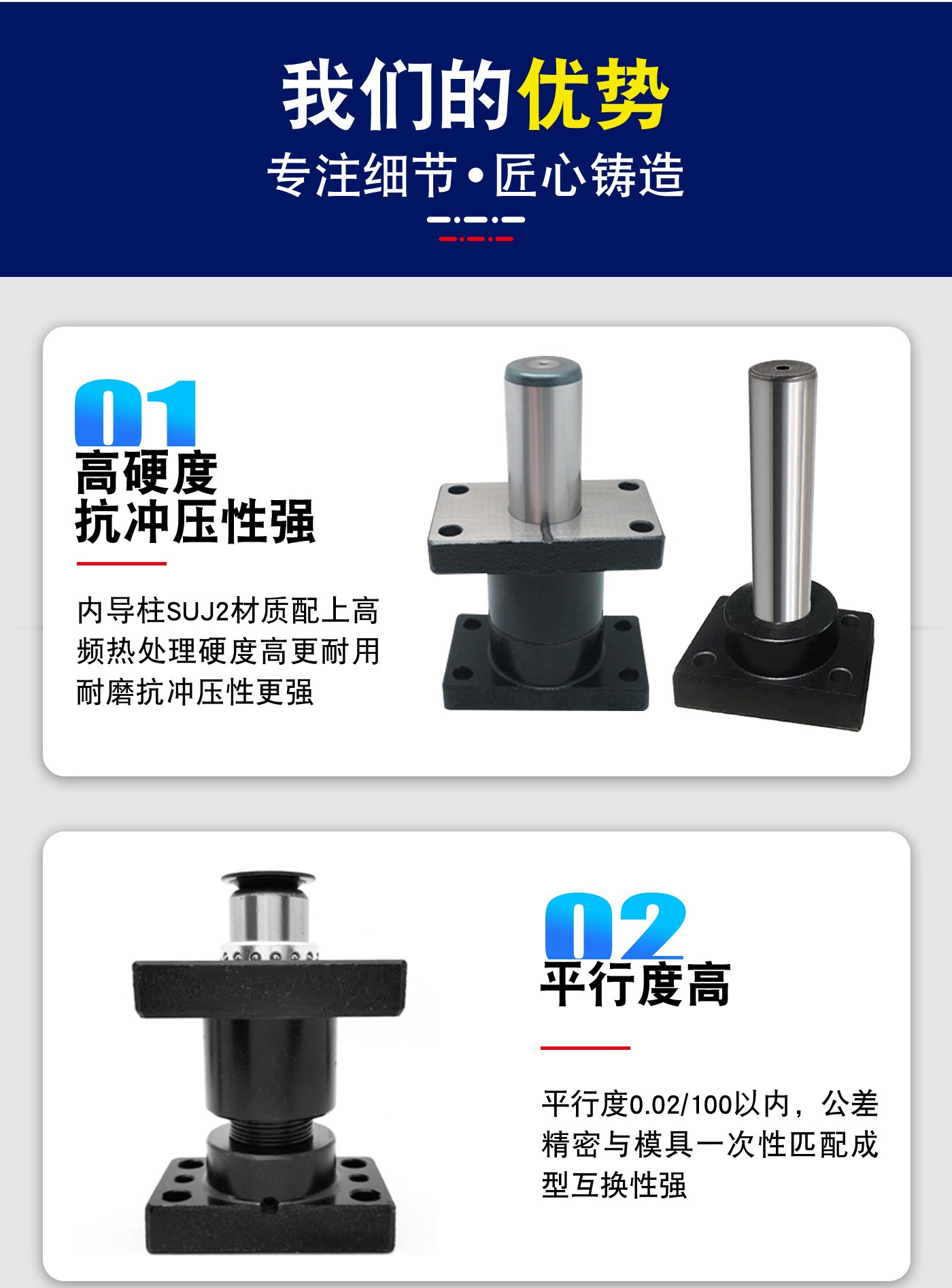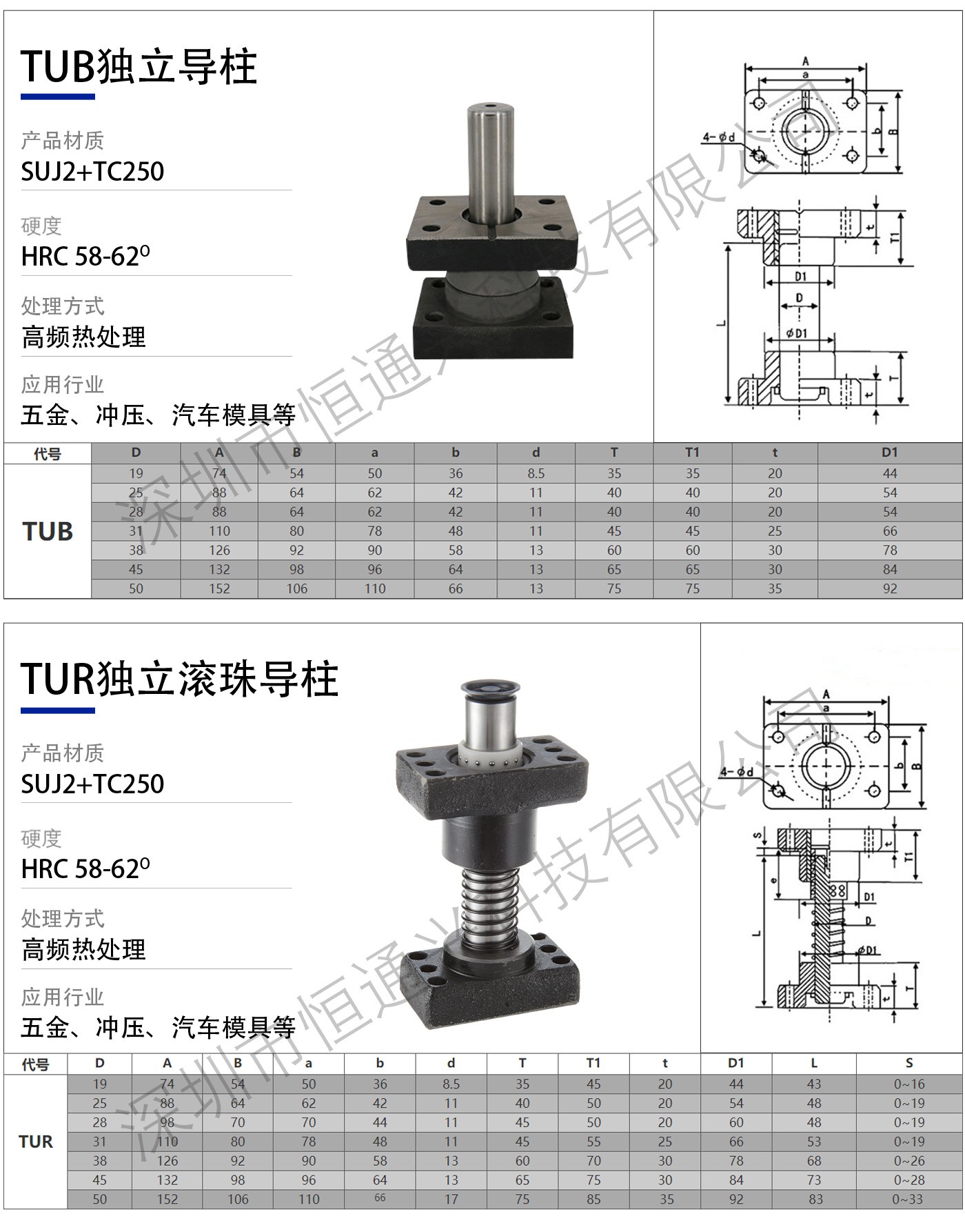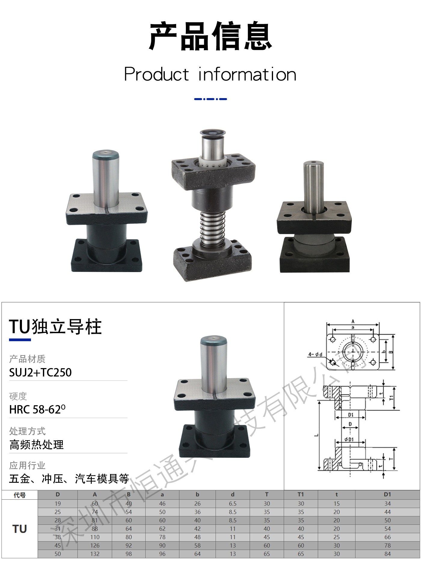 高剛性獨(dú)立式導(dǎo)柱導(dǎo)套廣泛應(yīng)用于汽車模,五金沖壓,大型沖床等行業(yè),恒通興專業(yè)21年生產(chǎn)加工TUR,TUB,TU獨(dú)立導(dǎo)柱,產(chǎn)品公差精度高,平行度高,抗沖壓耐磨損。