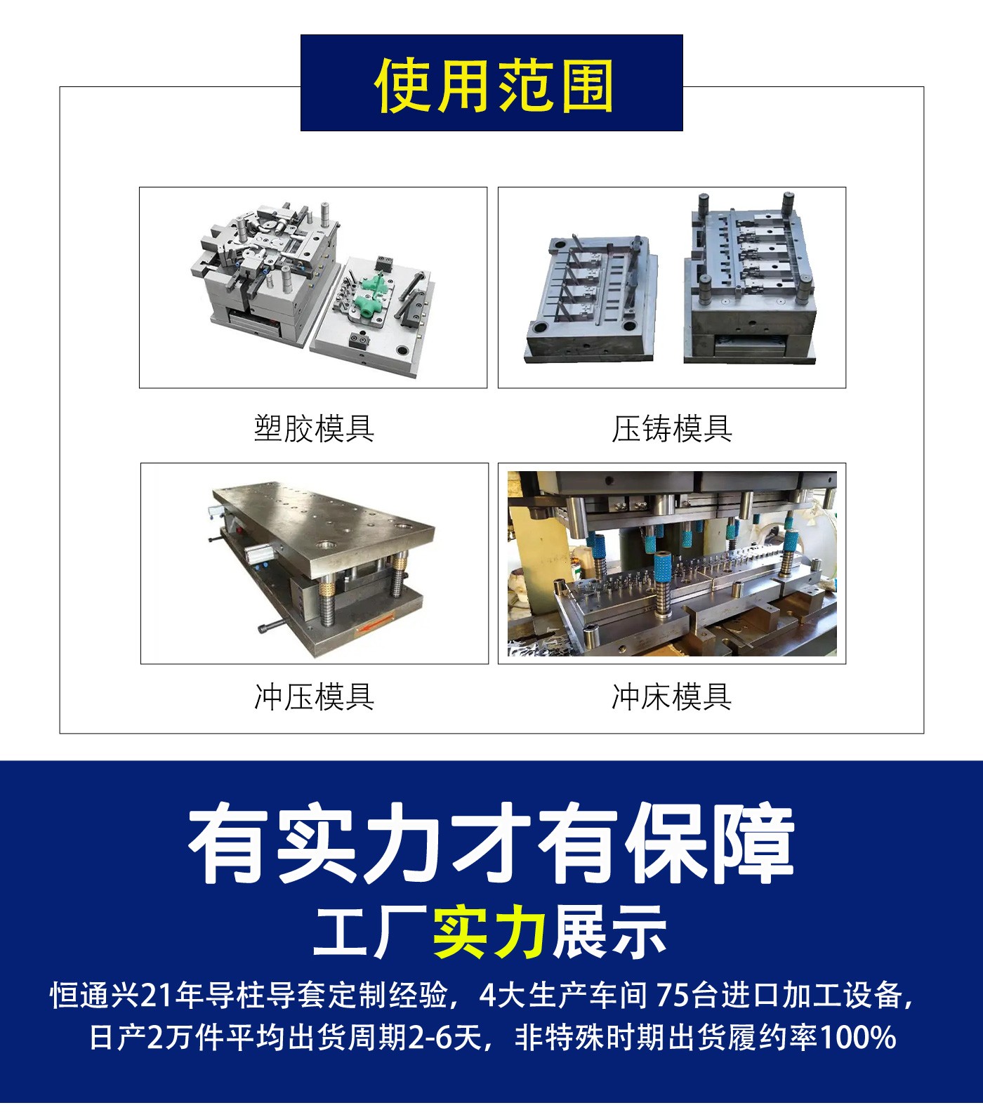 恒通興21年專注導(dǎo)柱導(dǎo)套生產(chǎn)加工,滾珠導(dǎo)柱導(dǎo)套標(biāo)準(zhǔn)現(xiàn)貨規(guī)格齊全,海量庫存,非標(biāo)可按圖定制,一站加工服務(wù),讓您省錢省心。