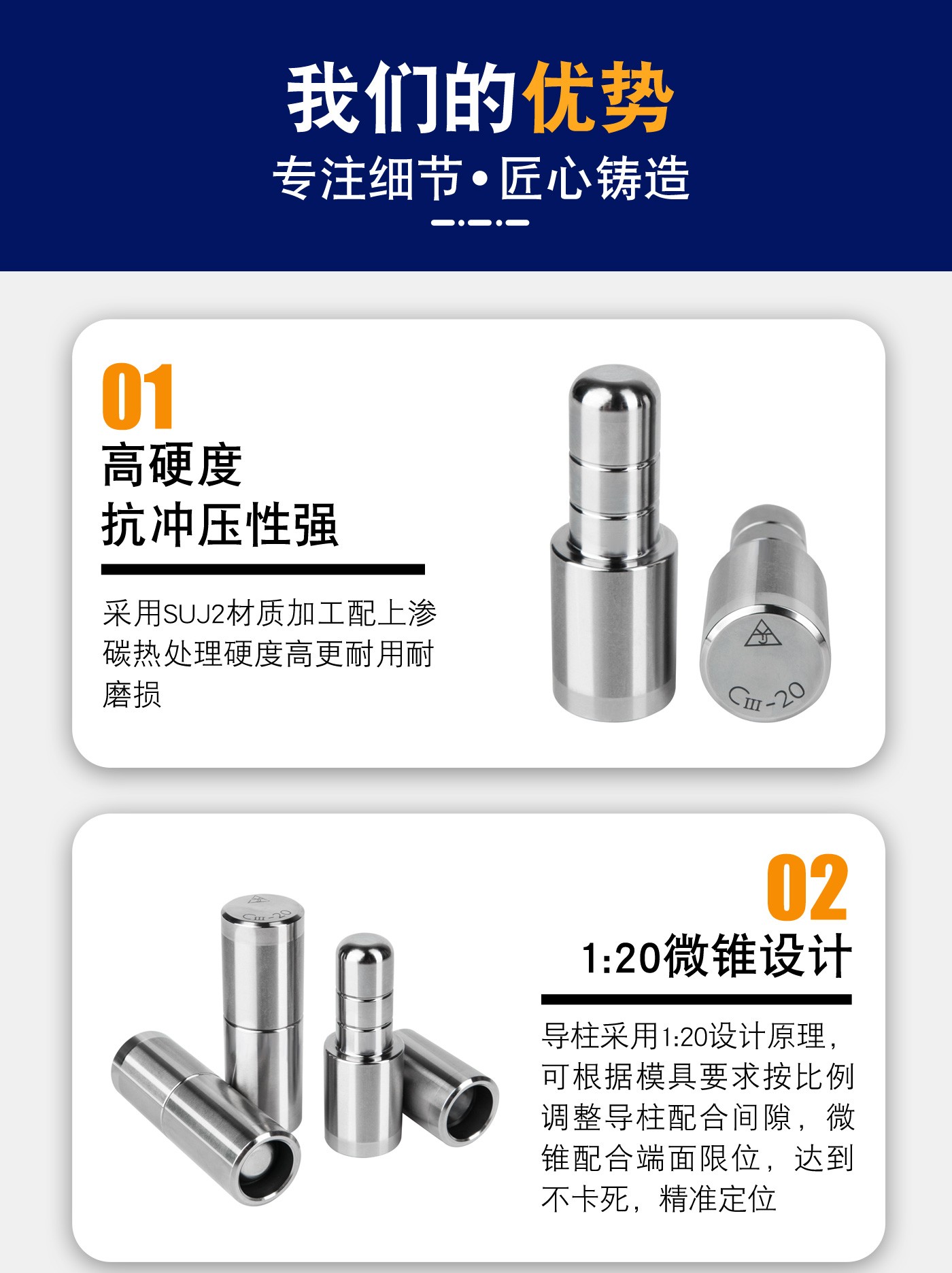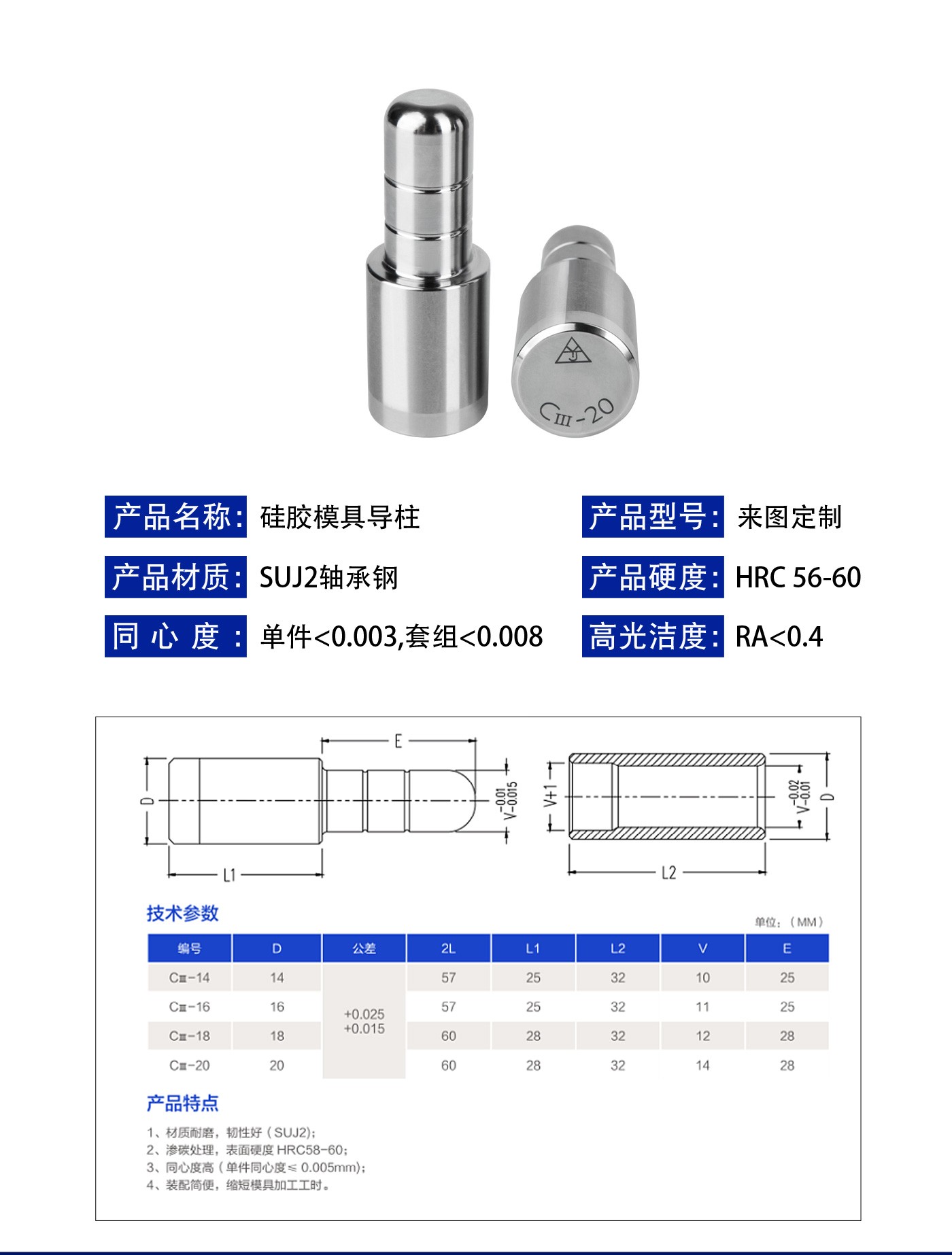 恒通興21年專注導(dǎo)柱導(dǎo)套生產(chǎn)加工,硅膠模具導(dǎo)柱標準現(xiàn)貨規(guī)格齊全,海量庫存,非標可按圖定制,一站加工服務(wù),讓您省錢省心。