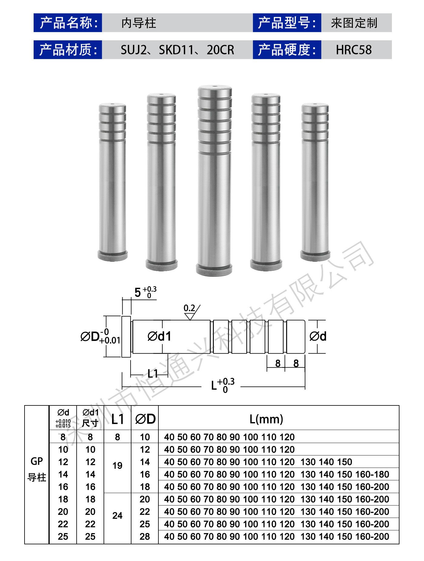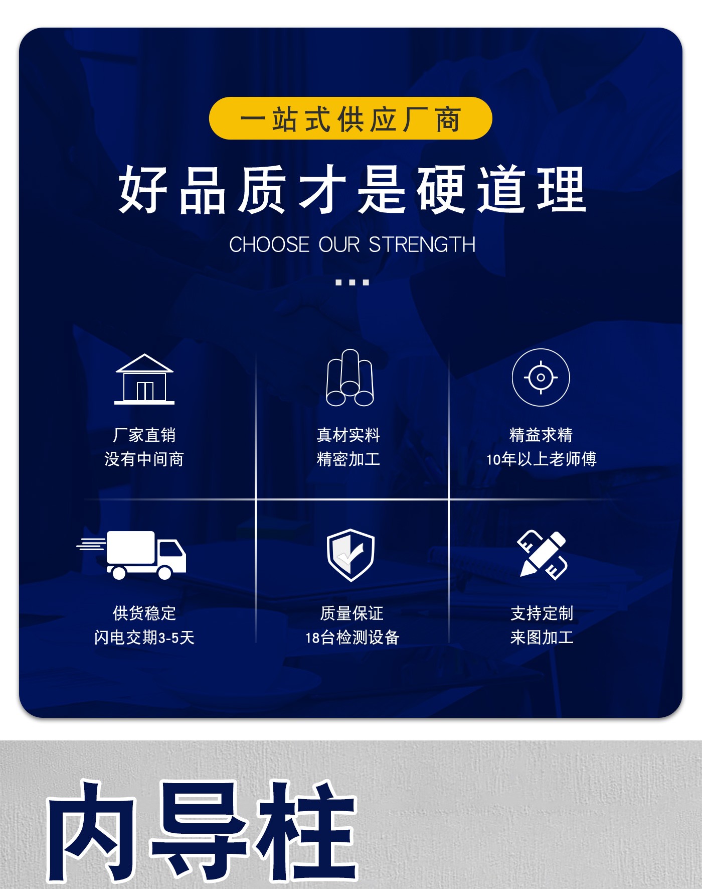 恒通興21年專注導(dǎo)柱導(dǎo)套生產(chǎn)加工,內(nèi)導(dǎo)柱標(biāo)準(zhǔn)現(xiàn)貨規(guī)格齊全,海量庫存,非標(biāo)可按圖定制,一站加工服務(wù),讓您省錢省心。