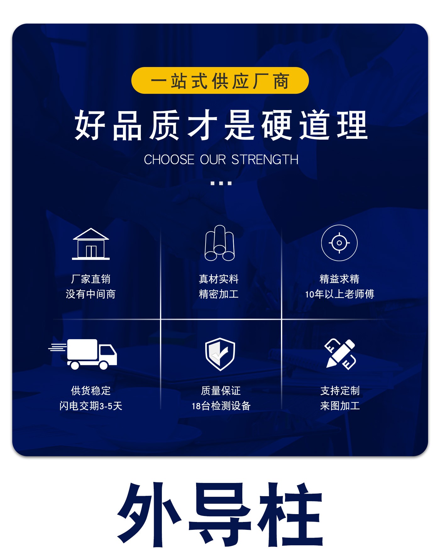 恒通興21年專注導柱導套生產(chǎn)加工,外導柱標準現(xiàn)貨規(guī)格齊全,海量庫存,非標可按圖定制,一站加工服務,讓您省錢省心。