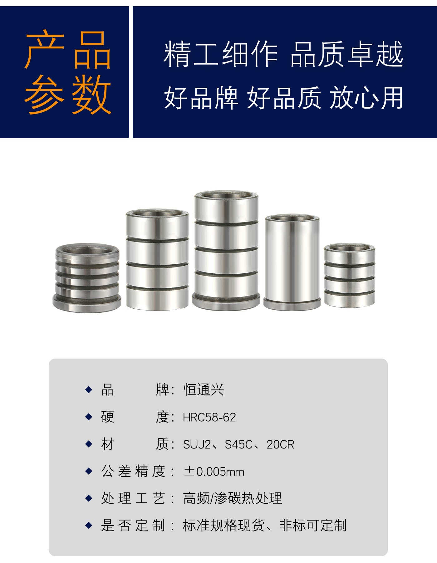 恒通興21年專注導柱導套生產(chǎn)加工,頂針板導套標準現(xiàn)貨規(guī)格齊全,海量庫存,非標可按圖定制,一站加工服務,讓您省錢省心。