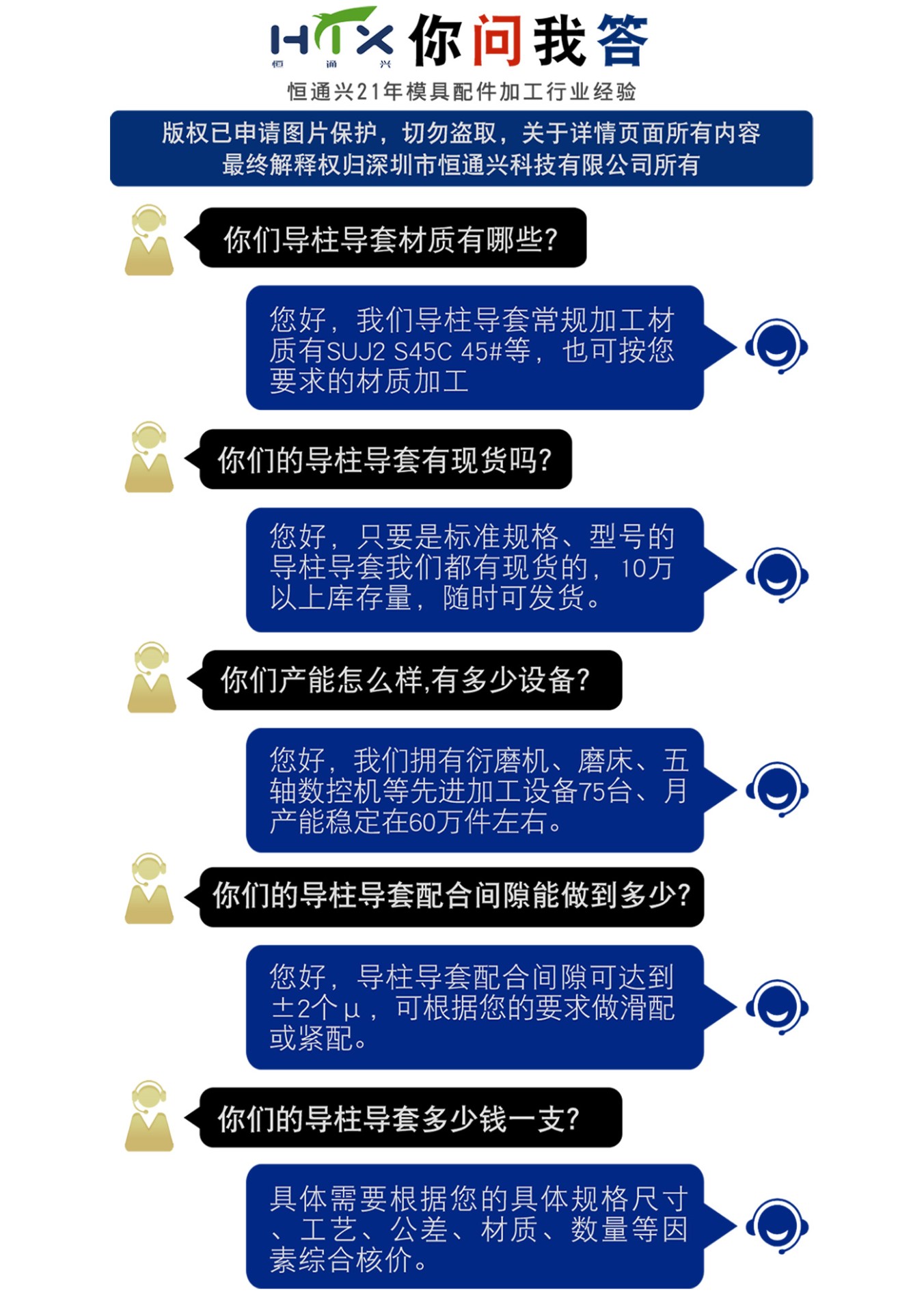 恒通興21年專注導(dǎo)柱導(dǎo)套生產(chǎn)加工,冷沖模導(dǎo)套標準現(xiàn)貨規(guī)格齊全,海量庫存,非標可按圖定制,一站加工服務(wù),讓您省錢省心。