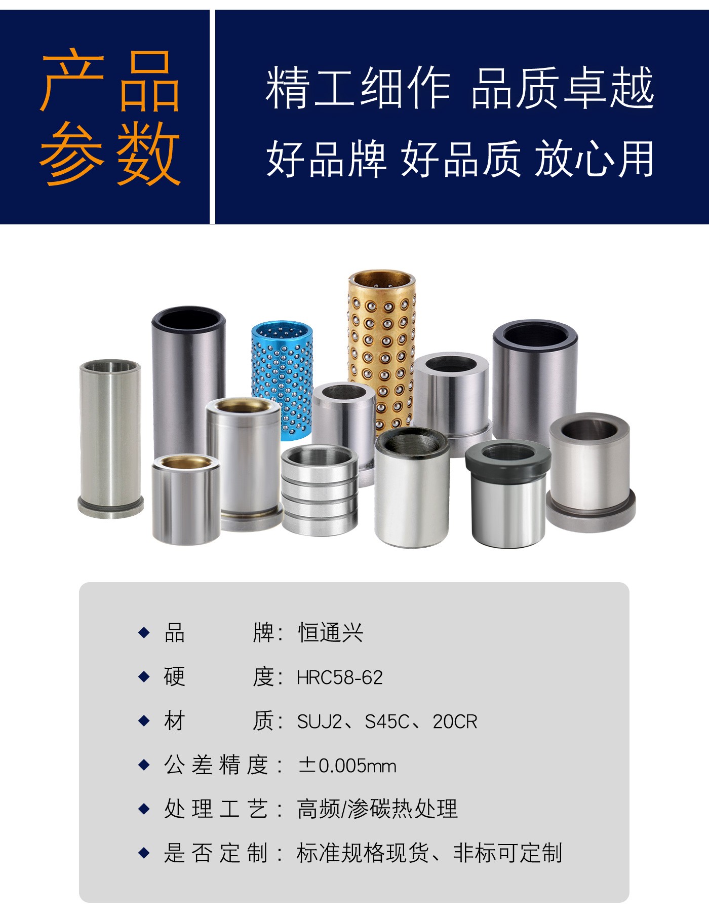 恒通興21年專注導(dǎo)柱導(dǎo)套生產(chǎn)加工,模具外導(dǎo)套標(biāo)準(zhǔn)現(xiàn)貨規(guī)格齊全,海量庫存,非標(biāo)可按圖定制,一站加工服務(wù),讓您省錢省心。