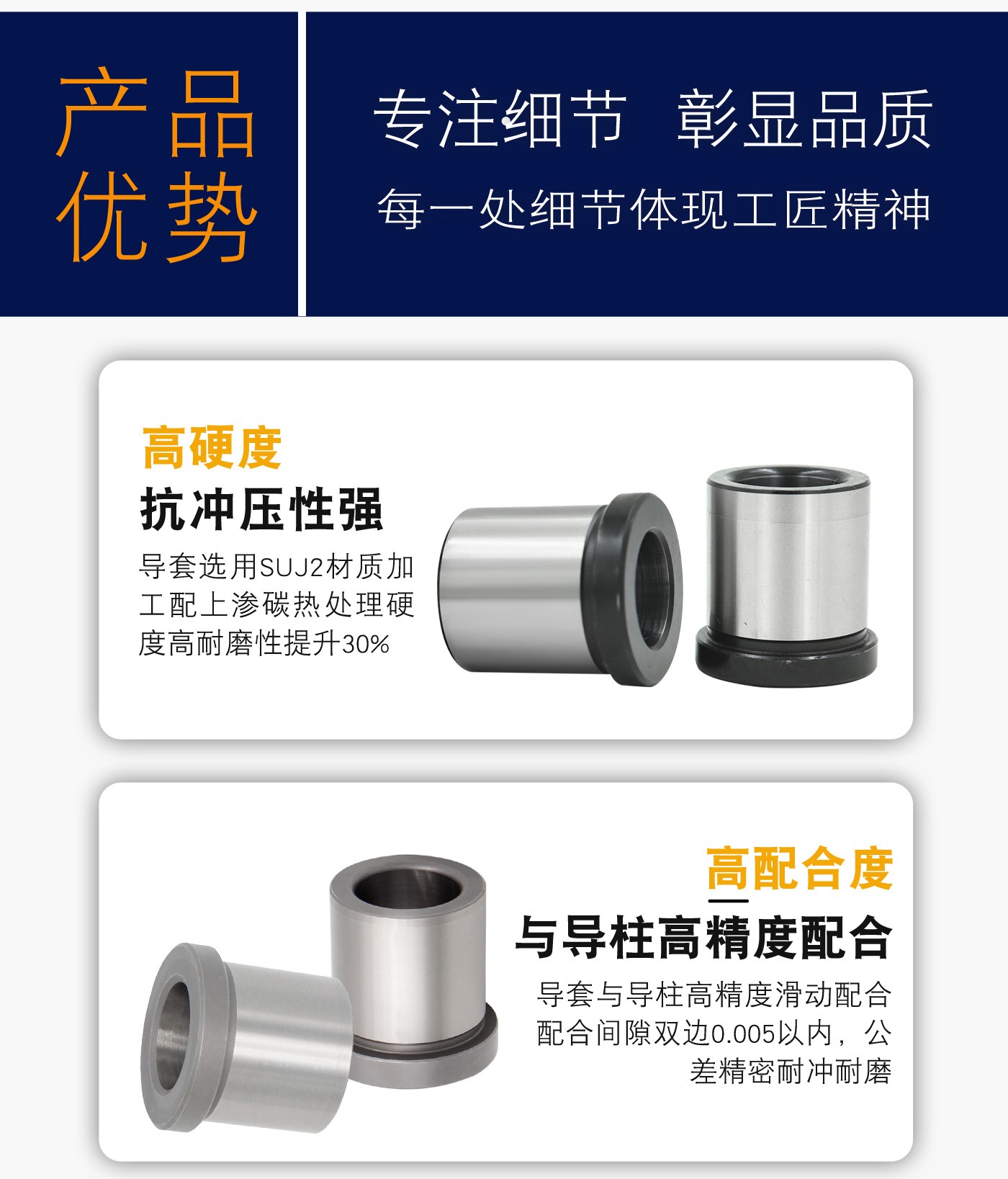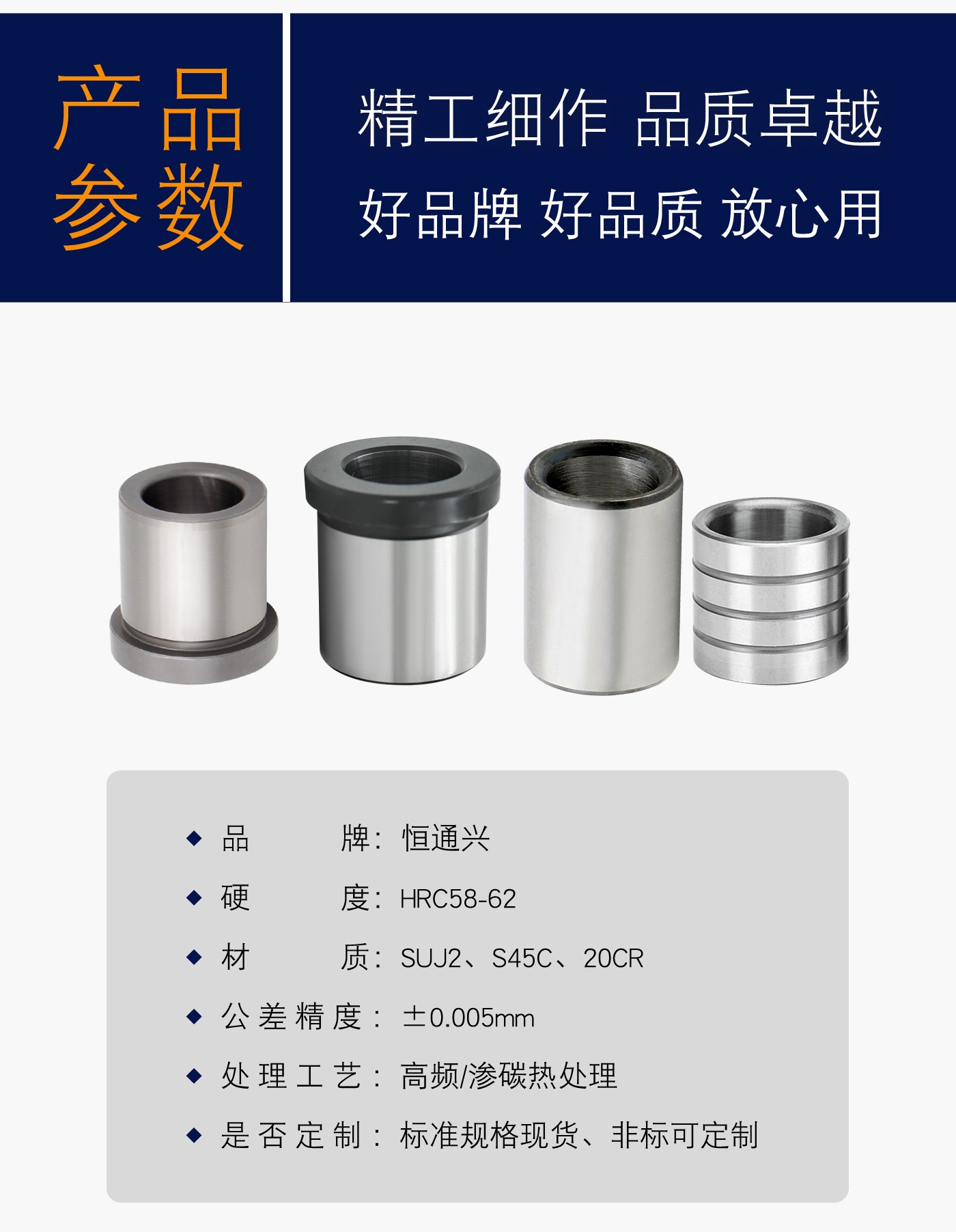 恒通興21年專注導(dǎo)柱導(dǎo)套生產(chǎn)加工,塑膠模具導(dǎo)套標(biāo)準(zhǔn)現(xiàn)貨規(guī)格齊全,海量庫存,非標(biāo)可按圖定制,一站加工服務(wù),讓您省錢省心。