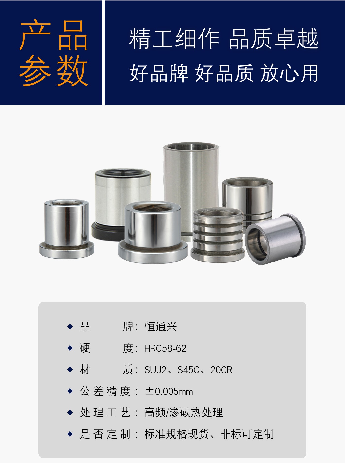 恒通興21年專注導柱導套生產(chǎn)加工,推板導套標準現(xiàn)貨規(guī)格齊全,海量庫存,非標可按圖定制,一站加工服務,讓您省錢省心。