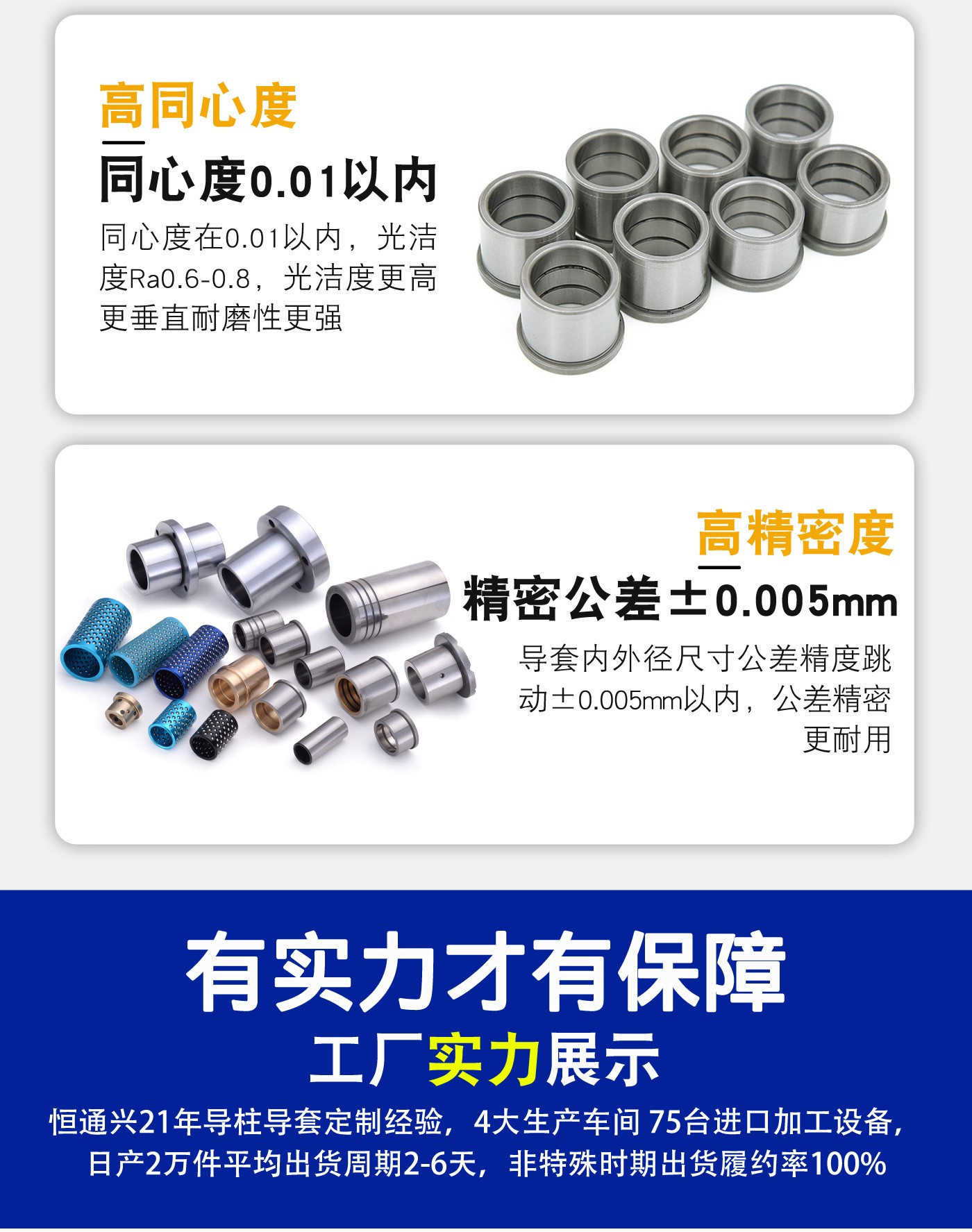 恒通興21年專注導(dǎo)柱導(dǎo)套生產(chǎn)加工,標(biāo)準(zhǔn)現(xiàn)貨導(dǎo)套規(guī)格齊全,海量庫存,非標(biāo)可按圖定制,一站加工服務(wù),讓您省錢省心。