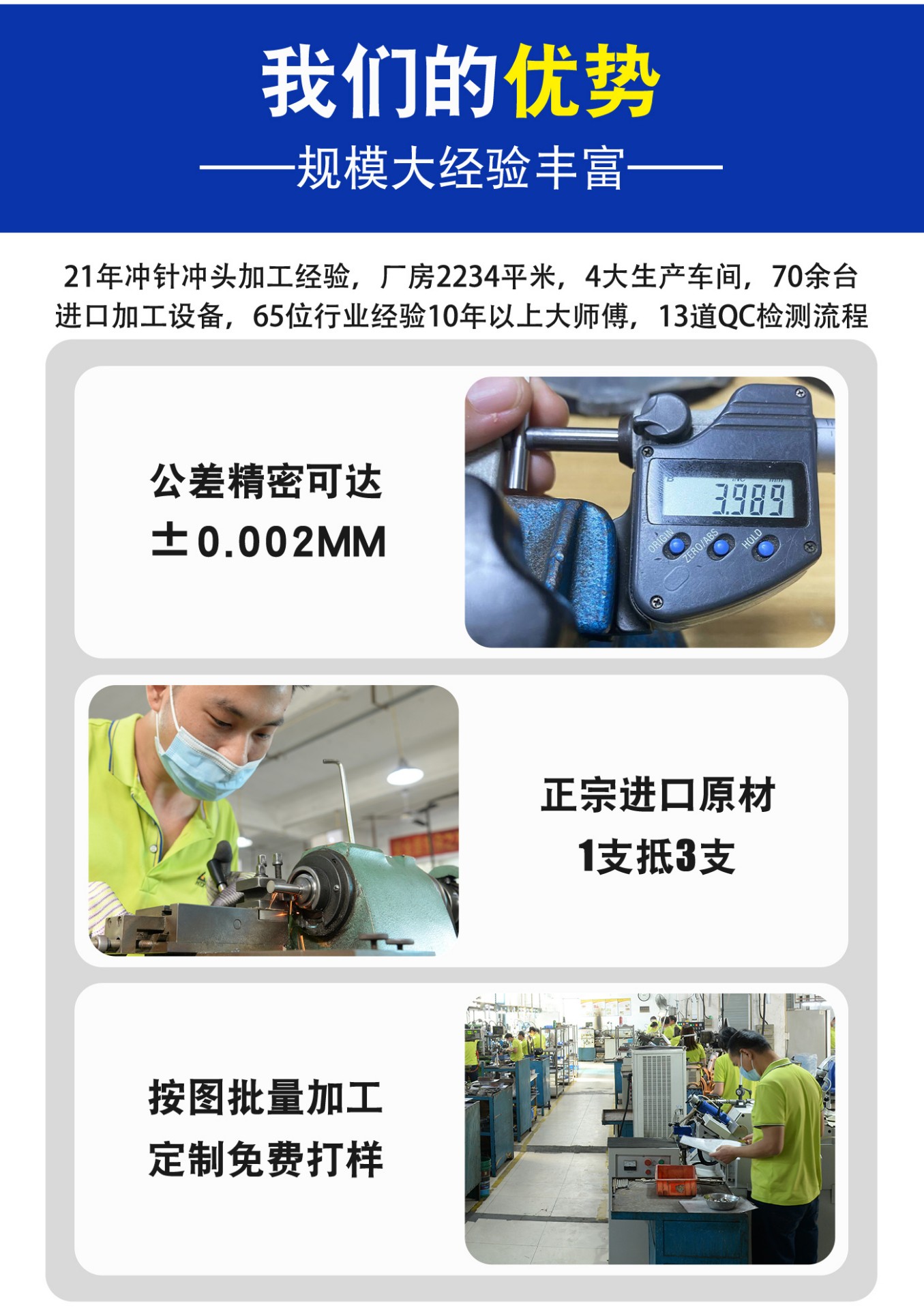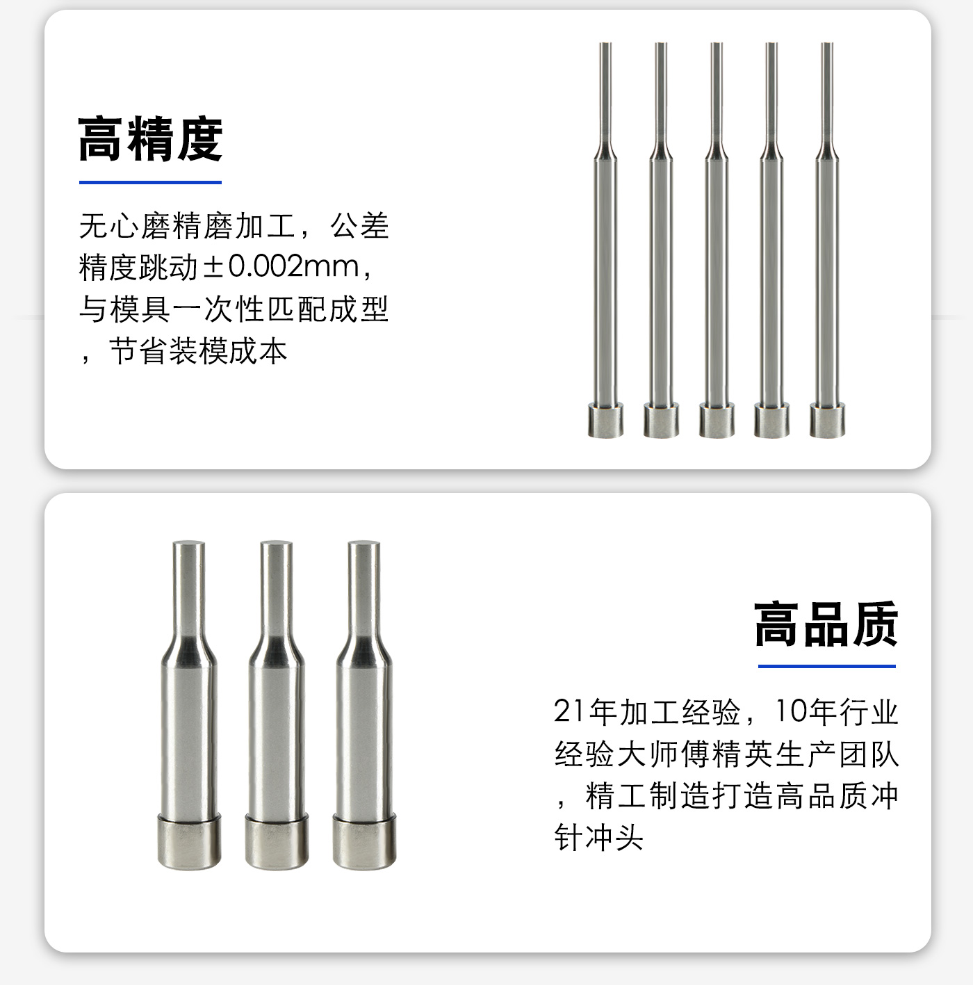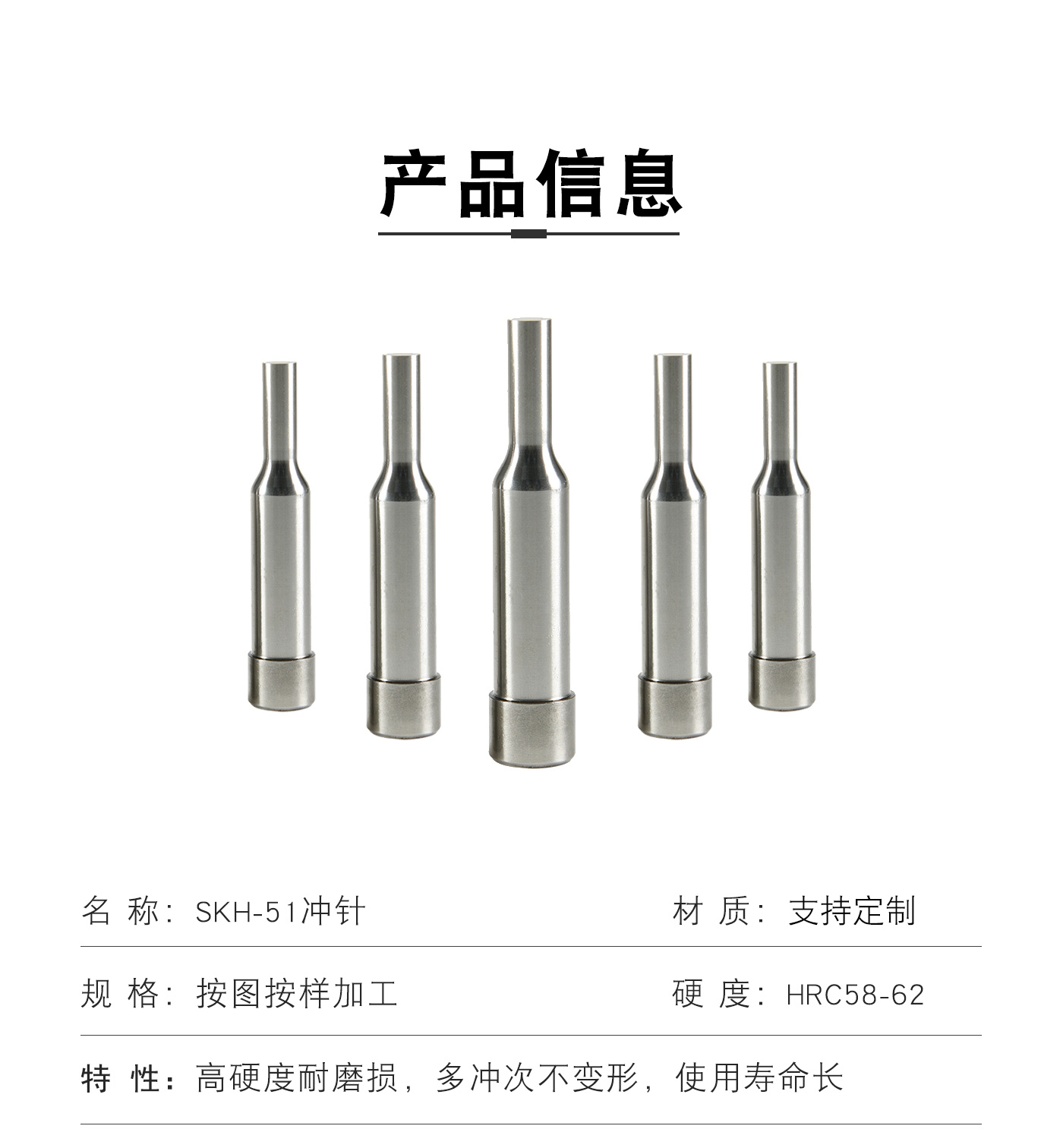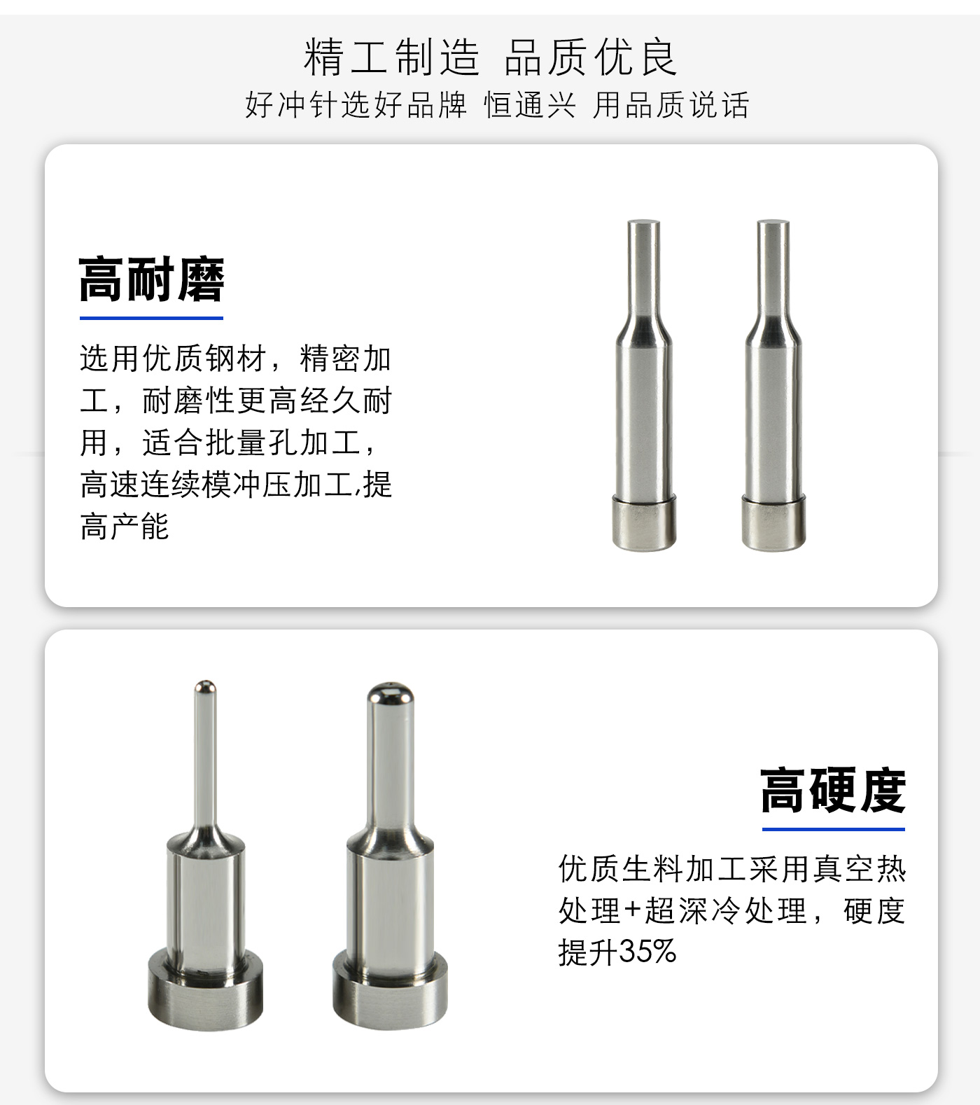 恒通興專業(yè)生產(chǎn)加工各種非標skh51沖針,21年沖針沖頭加工經(jīng)驗,產(chǎn)品公差精度高,耐沖耐磨,使用壽命長。