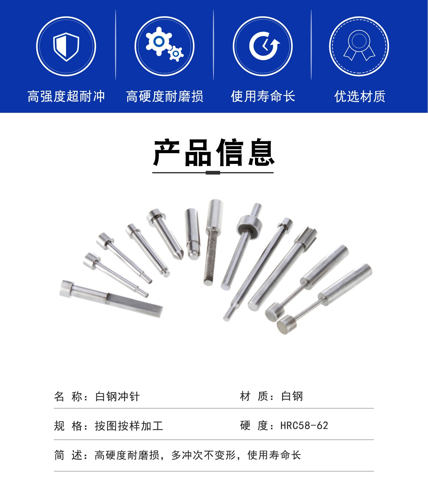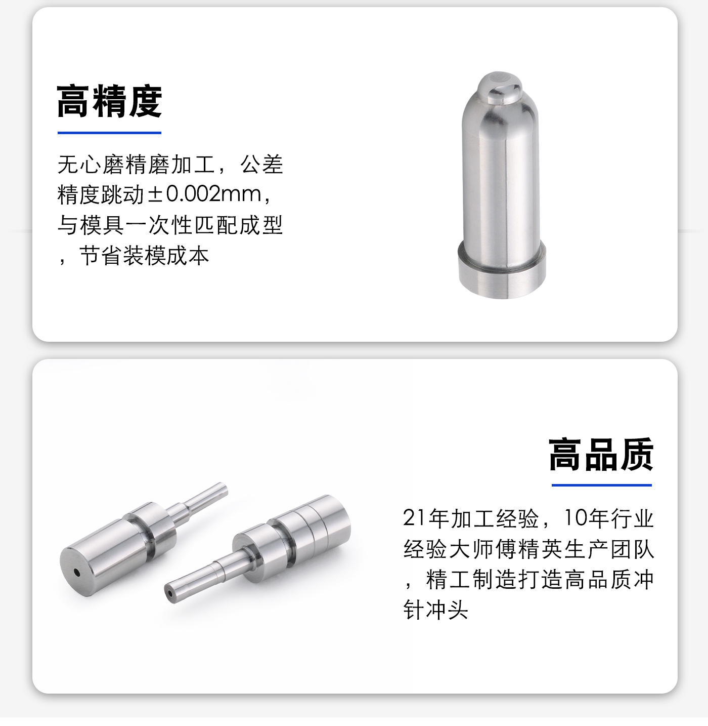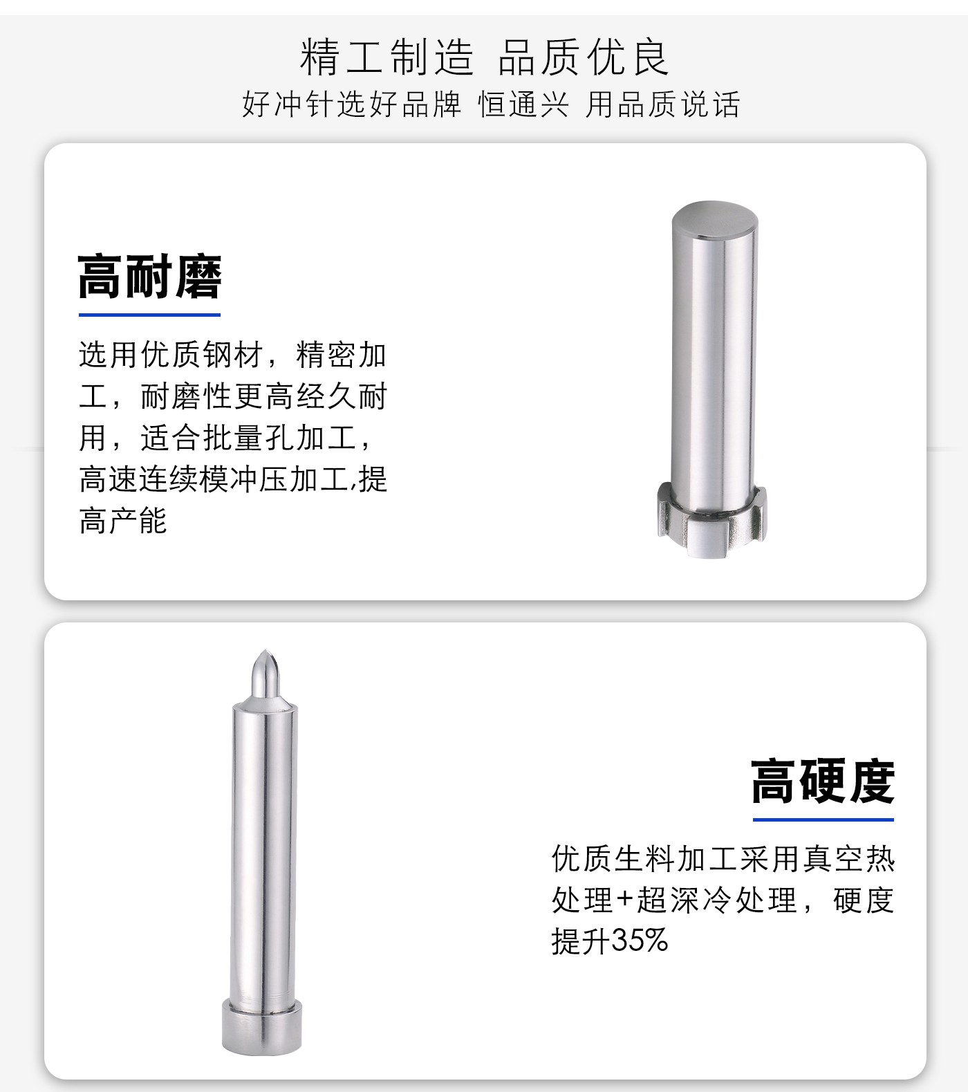 深圳市恒通興科技專業(yè)21年加工定制白鋼沖針等各種材質(zhì)沖針沖頭,產(chǎn)品材質(zhì)正宗,公差精度±0.002mm,硬度高耐磨損,使用壽命強3倍。