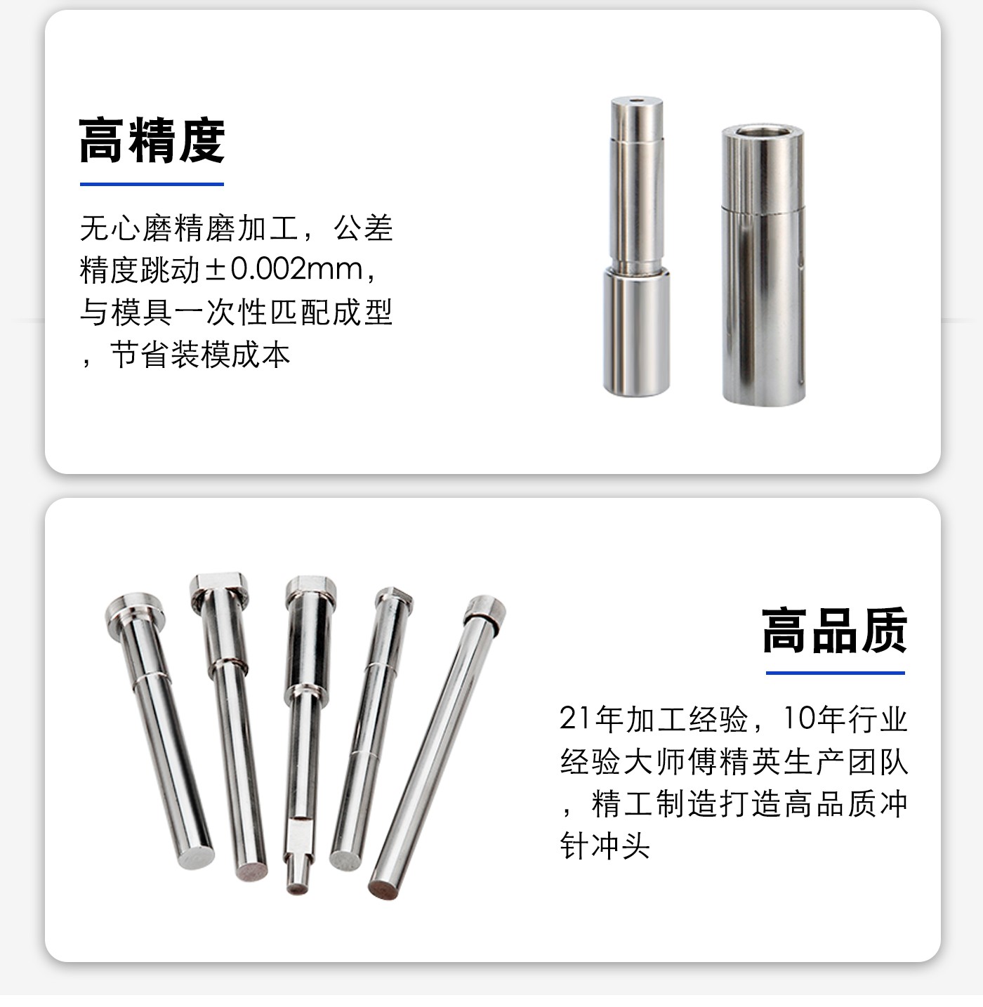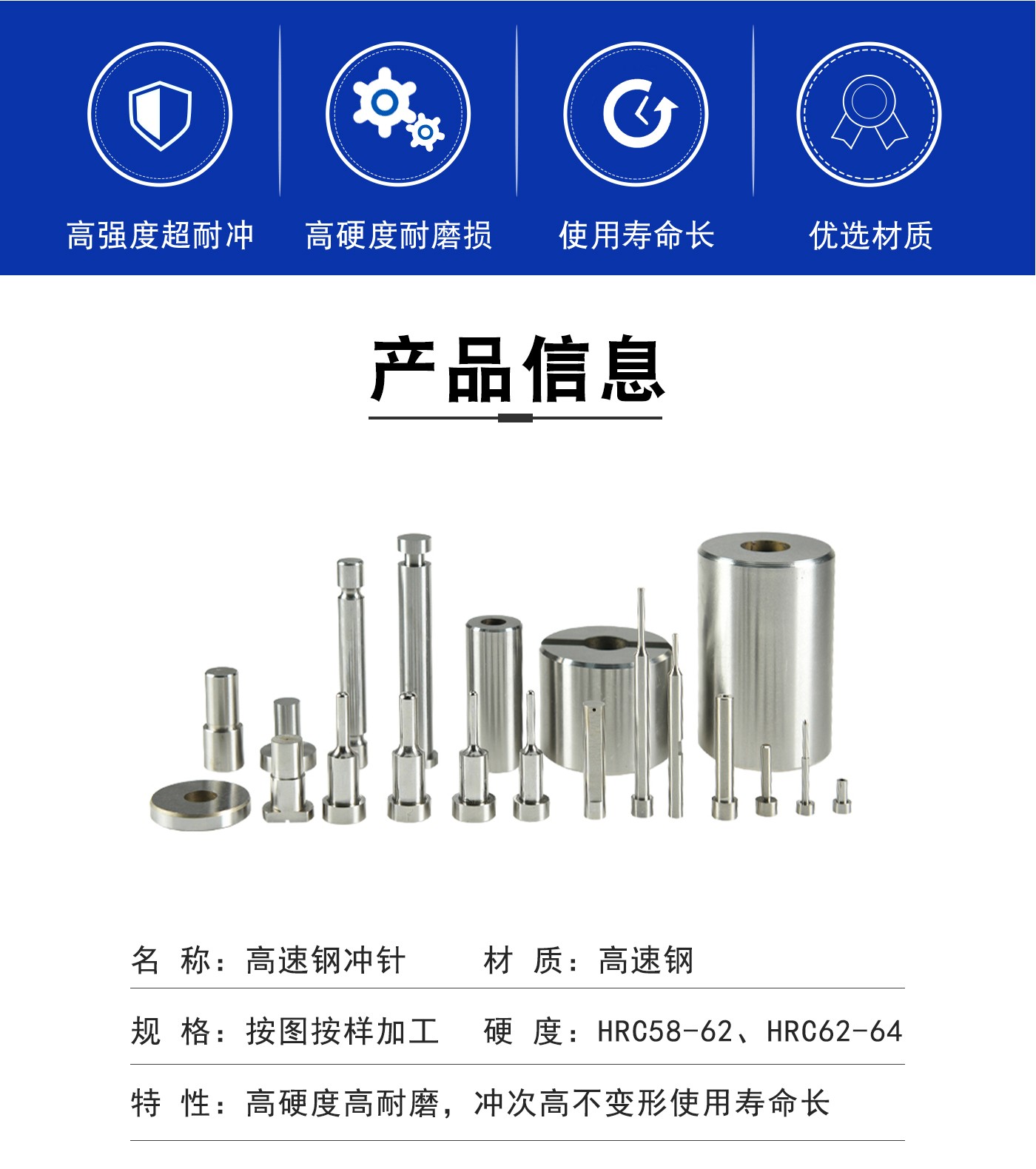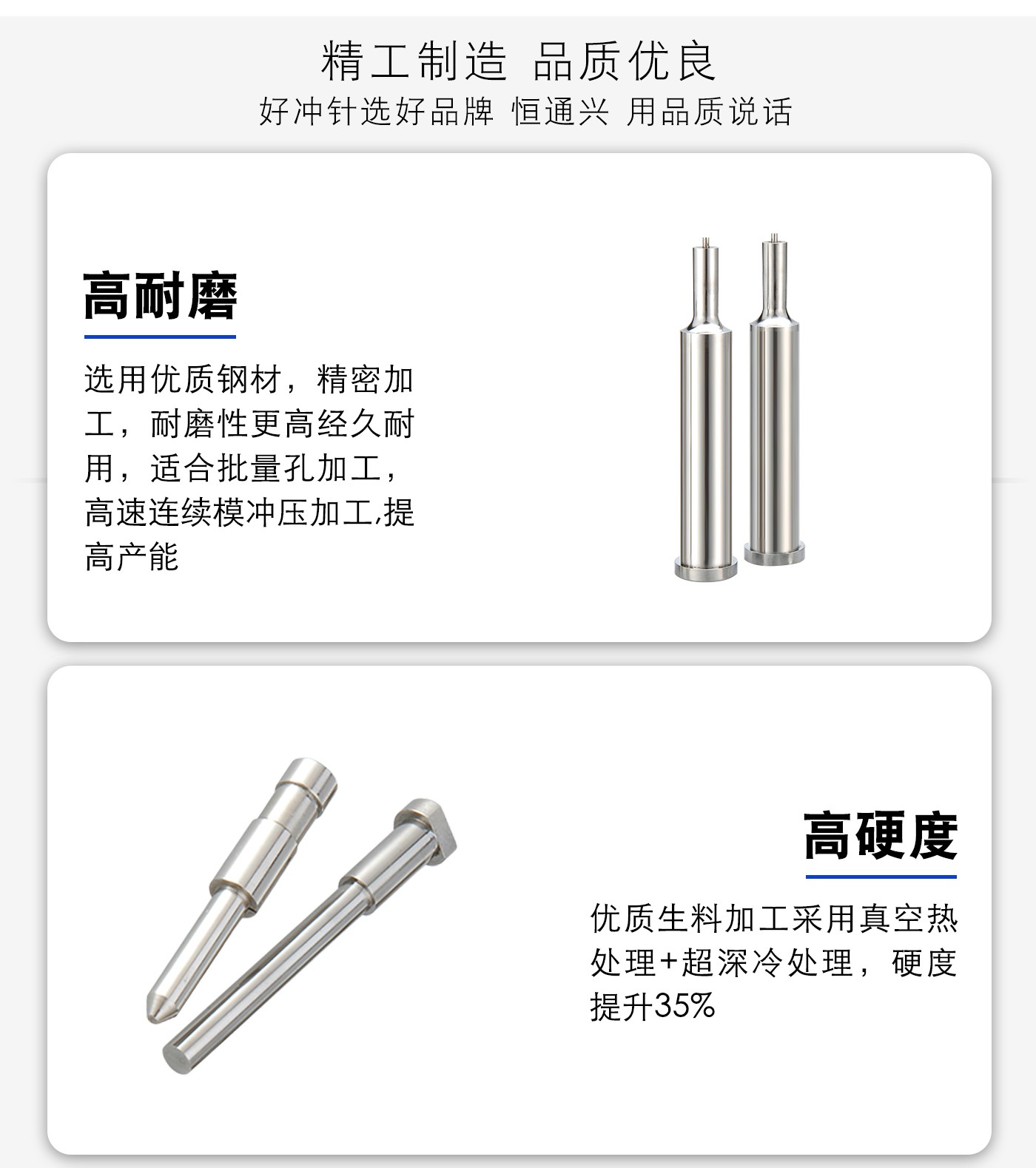 深圳市恒通興科技專業(yè)21年加工定制高速鋼沖針等各種材質(zhì)沖針沖頭,產(chǎn)品材質(zhì)正宗,公差精度±0.002mm,硬度高耐磨損,使用壽命強(qiáng)3倍。