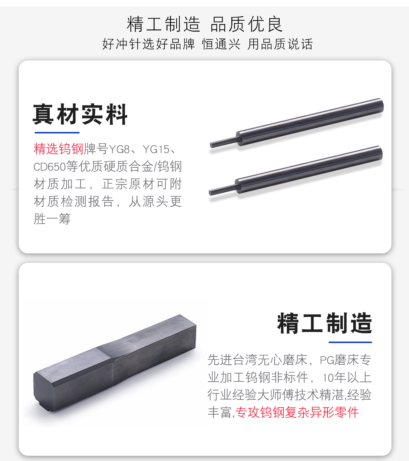深圳市恒通興科技21年專業(yè)加工硬質(zhì)合金沖針等各種材質(zhì)沖針沖頭,產(chǎn)品材質(zhì)正宗,公差精度±0.002mm,硬度高耐磨損,使用壽命強(qiáng)5倍。