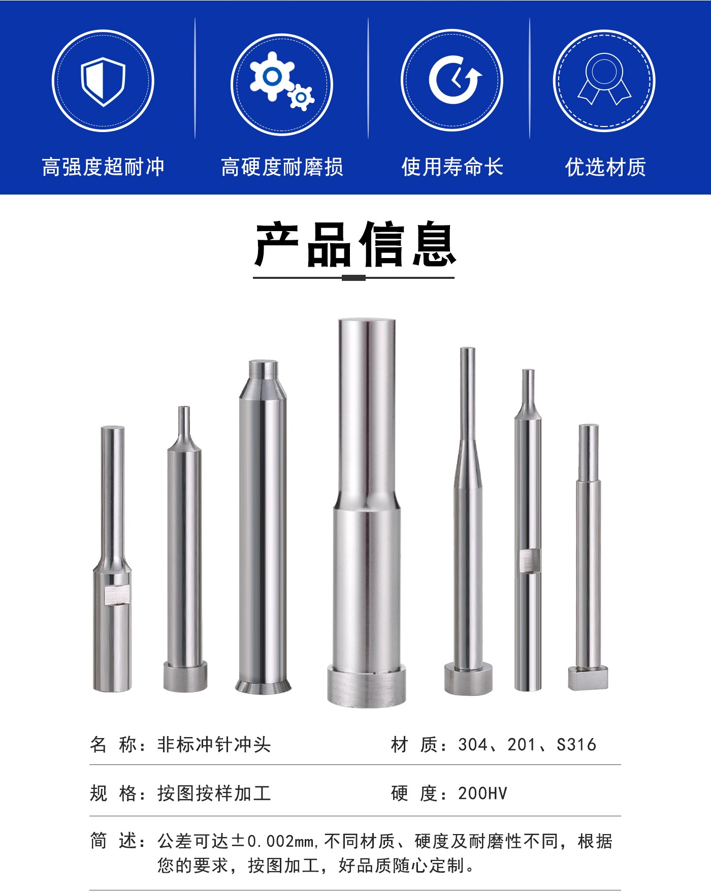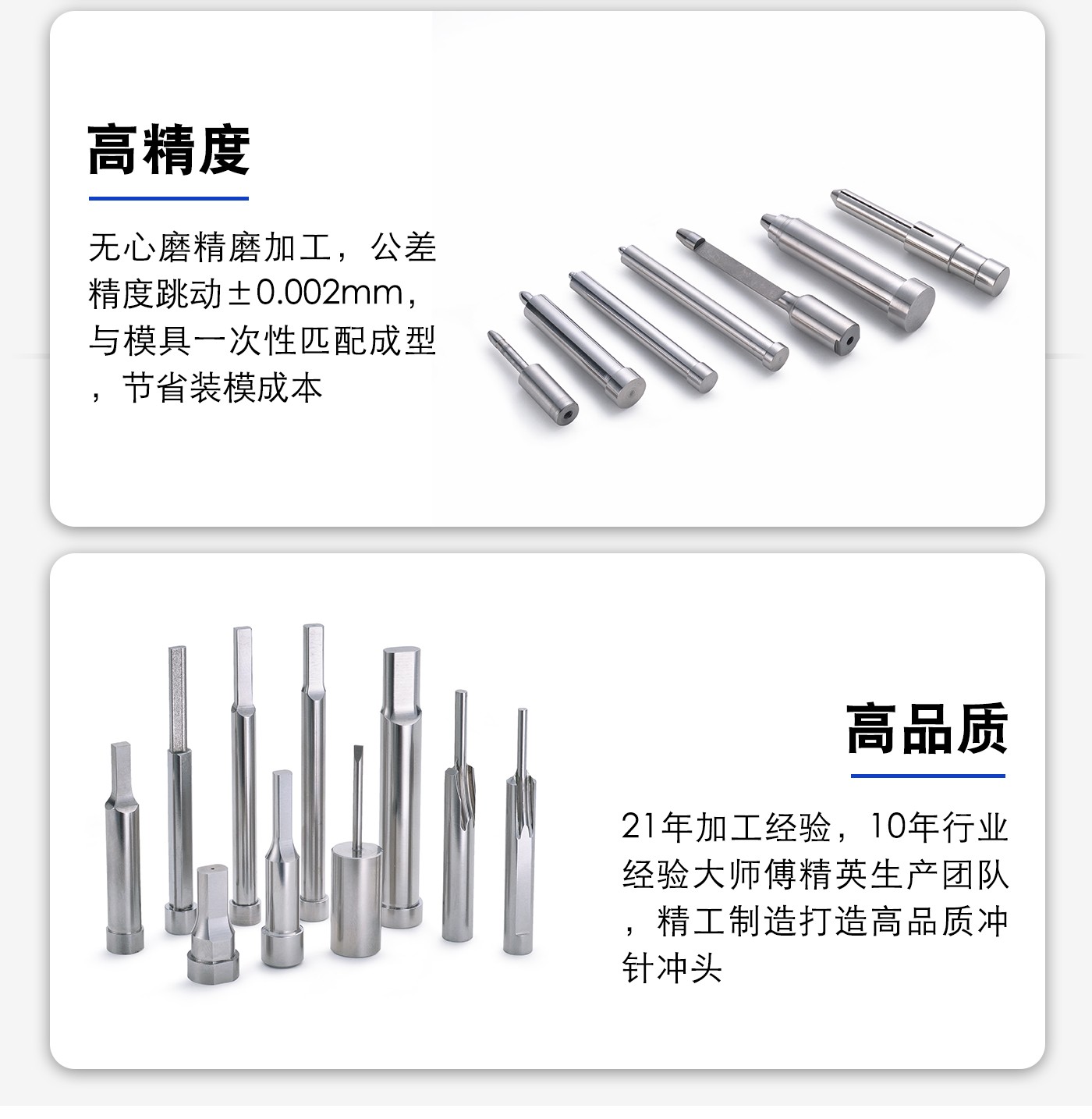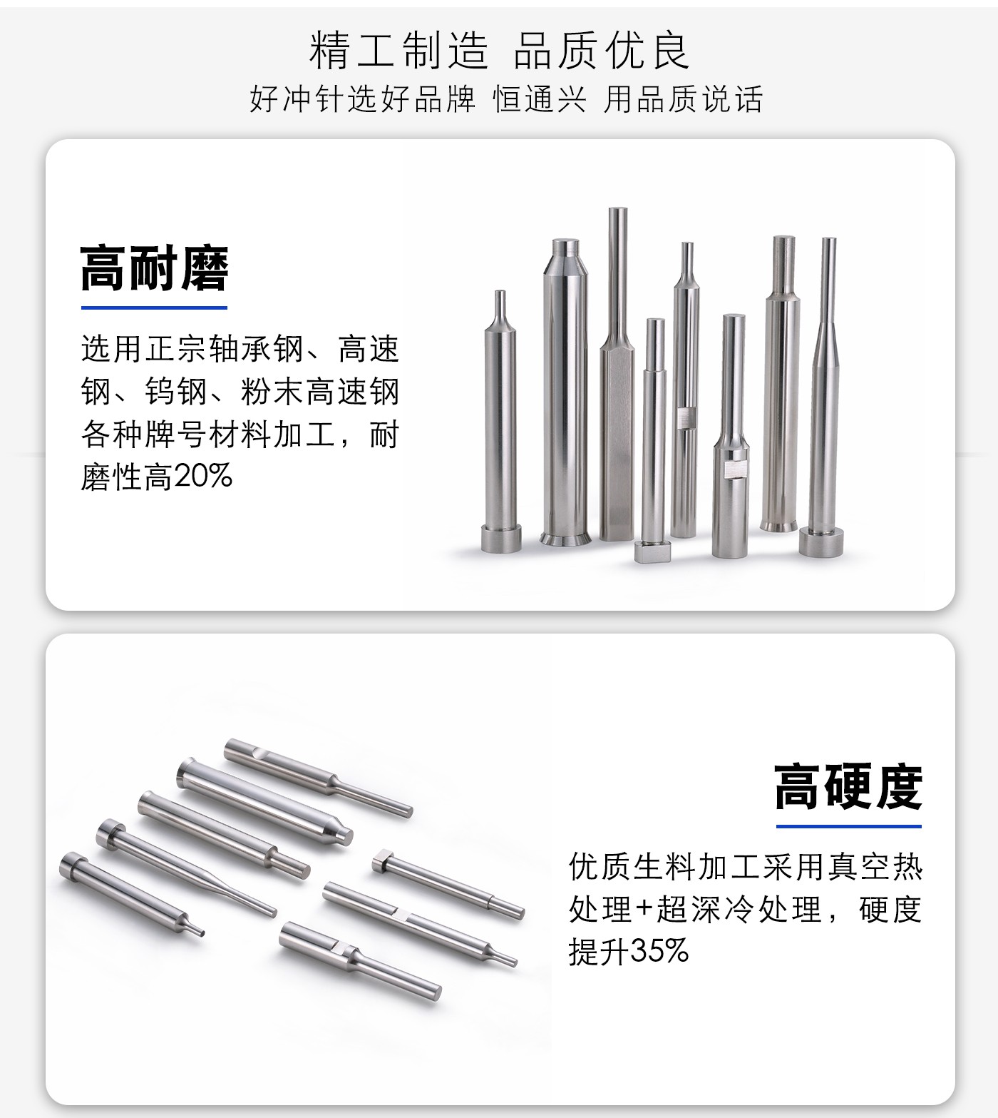 深圳市恒通興科技21年專業(yè)加工不銹鋼沖針等各種材質沖針沖頭,產品材質正宗,公差精度±0.002mm,硬度高耐磨損。